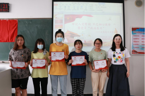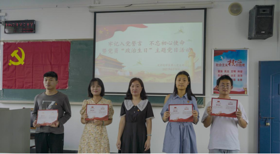 教工党支部书记王惠宣布了建立的教工党员“政治生日”花名册。党委书记申自强和教工支部书记王惠向“政治生日”在第一、第二季度的教工党员赠送了“政治生日”贺卡,大家感受到了党组织浓浓的关爱之情。铮铮誓言,铿锵有力,在庄严肃穆的氛围中,大家一起高举右手重温了入党誓词。大家一起观看学习了太阳成tyc122cc集团师生拍摄的党史专题教育片《红色曹沟,独立千秋》和《用奋斗谱写青春之歌——中原大学》,接受革命传统教育,深刻领悟革命先辈无私奉献、勇往直前、敢为天下先的奋斗精神与忧国忧民的爱国情怀。