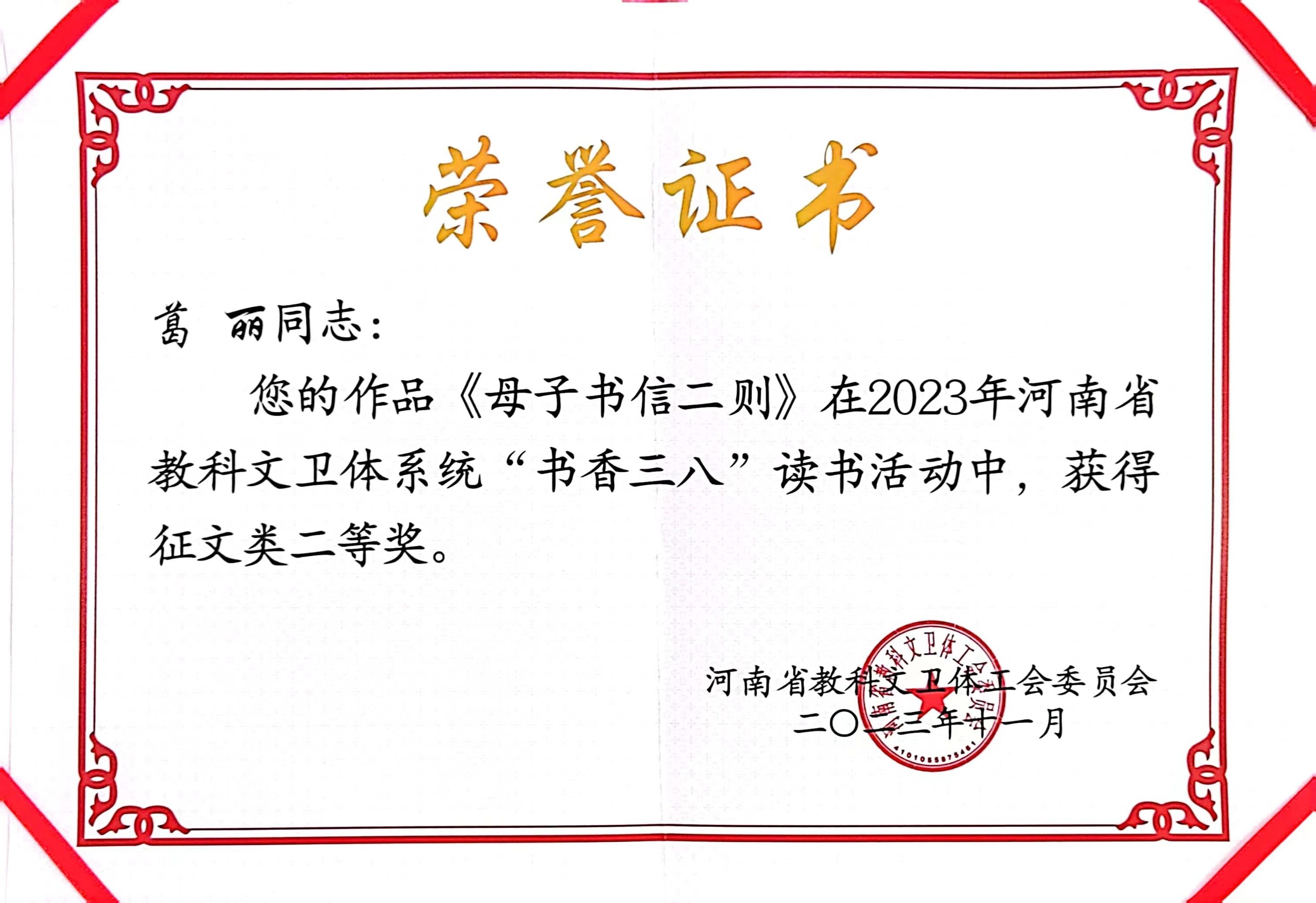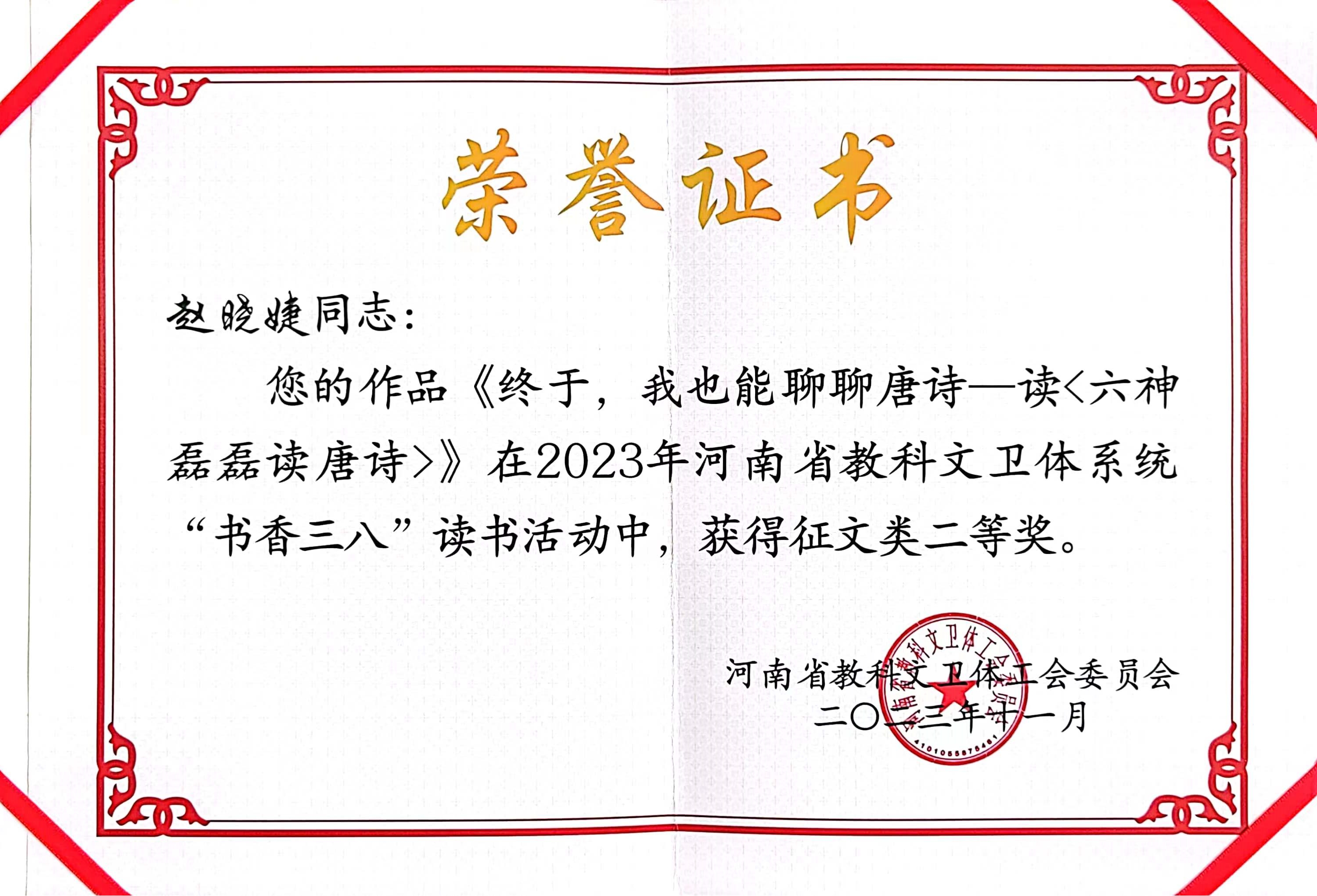 近日,河南省教科文卫体工会通报了2023年“书香三八”读书活动获奖情况,公司教师获3个二等奖,分别是赵晓婕的《终于,我也能聊聊唐诗——<六神磊磊读唐诗>》《那一年 我不知道的便条纸》,葛丽的《母子书信二则》。