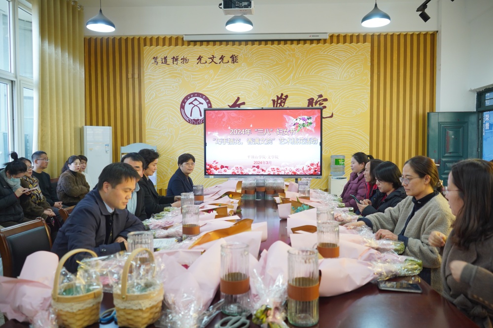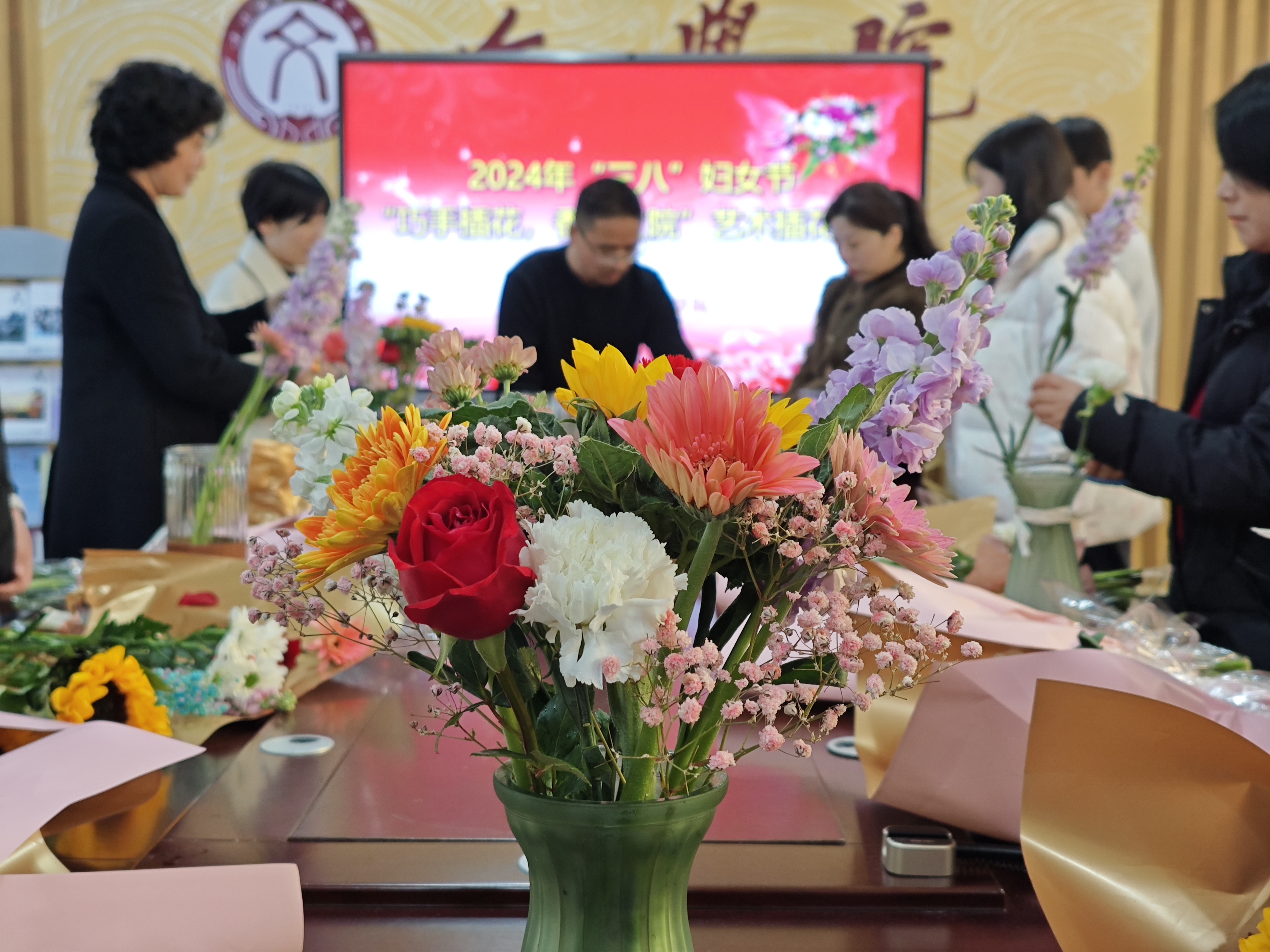 为庆祝第114个“三八”国际妇女节,让太阳成tyc122cc集团教职工放松身心,以更饱满的热情投入工作,3月7日下午,太阳成tyc122cc集团分工会在1301会议室举办“巧手插花,香满文院”艺术插花活动。活动分为女教工代表交流发言、男教工代表送祝福、艺术插花等环节。活动由公司党委书记申自强主持。