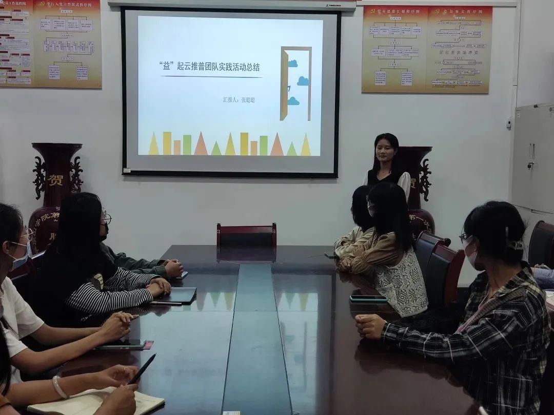 “益”起云推普团队成员张聪聪对活动的准备、开展和总结做了详细的汇报。从备课到制作PPT课件,从课件制作到设备调试,团队成员反复讲、演、练,力求以最好的方式推广普通话,这正是“益”起云推普的意义所在。