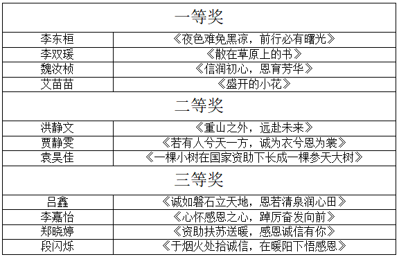 为深入学习贯彻习近平新时代中国特色社会主义思想,认真落实党的二十大关于 “完善覆盖全学段员工资助体系”的重要决策部署,强化资助育人成效,普及征信知识,公司于4月10日-18日举办“诚信校园行”征文大赛。经班级初选,院系评选,最终评出一等奖4名,二等奖3名,三等奖4名,具体获奖名单如下: