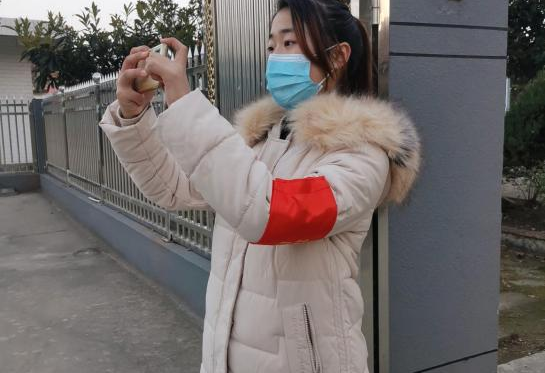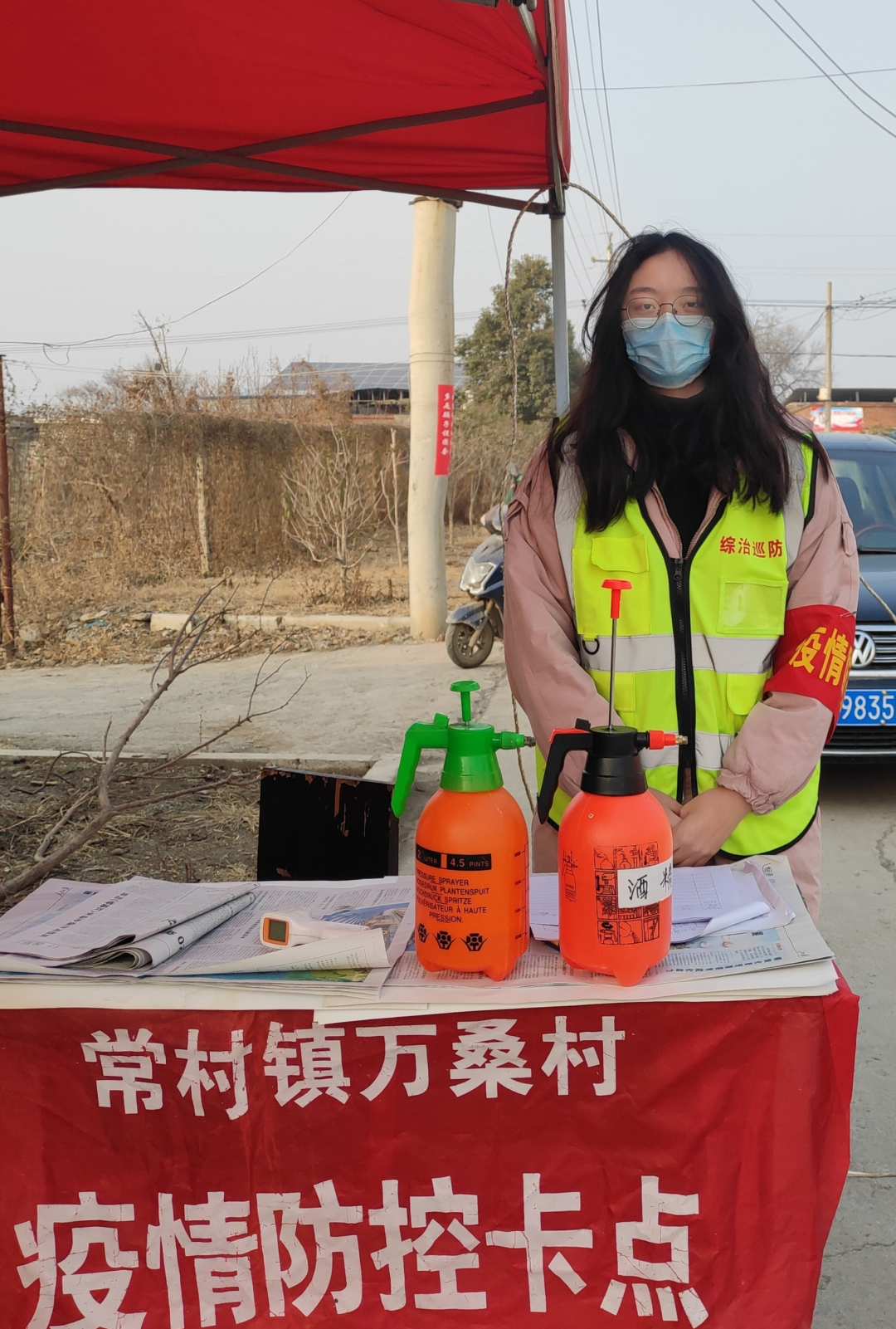 寒假返家后,刘雨同学投入到河南省辉县市常村镇万桑村的疫情防控志愿活动中,负责记录出入人员信息,进行体温测量和消毒等工作。