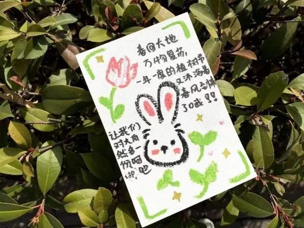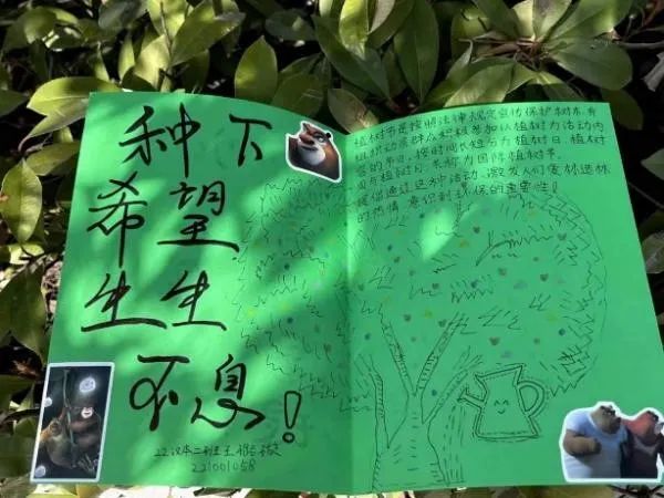 “种下希望,生生不息”“春生万物,护绿先行”。张张贺卡,点点心意,生态保护,势在必行。绿意盎然的贺卡、肆意生长的树木、发自肺腑的文字、活泼的动物贴纸,讲述着动植物命运与共、息息相关,是一个生命共同体;绿意生长描绘着“生”的希望,展现了同学们对大自然的热爱,扑面而来的绿色气息,仿佛向我们展示了树木成林,一片生机勃勃的景象。
