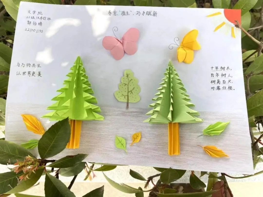 以植树节为主题折纸剪纸活动通过做出多样的图案,表达对环保的看法及心意,激发同学们爱林造林的感情,使同学们亲近自然,重视环保。春回大地,万物复苏,同学们通过剪纸的形式传达着他们对植树节的看法,以及对大自然的热爱。