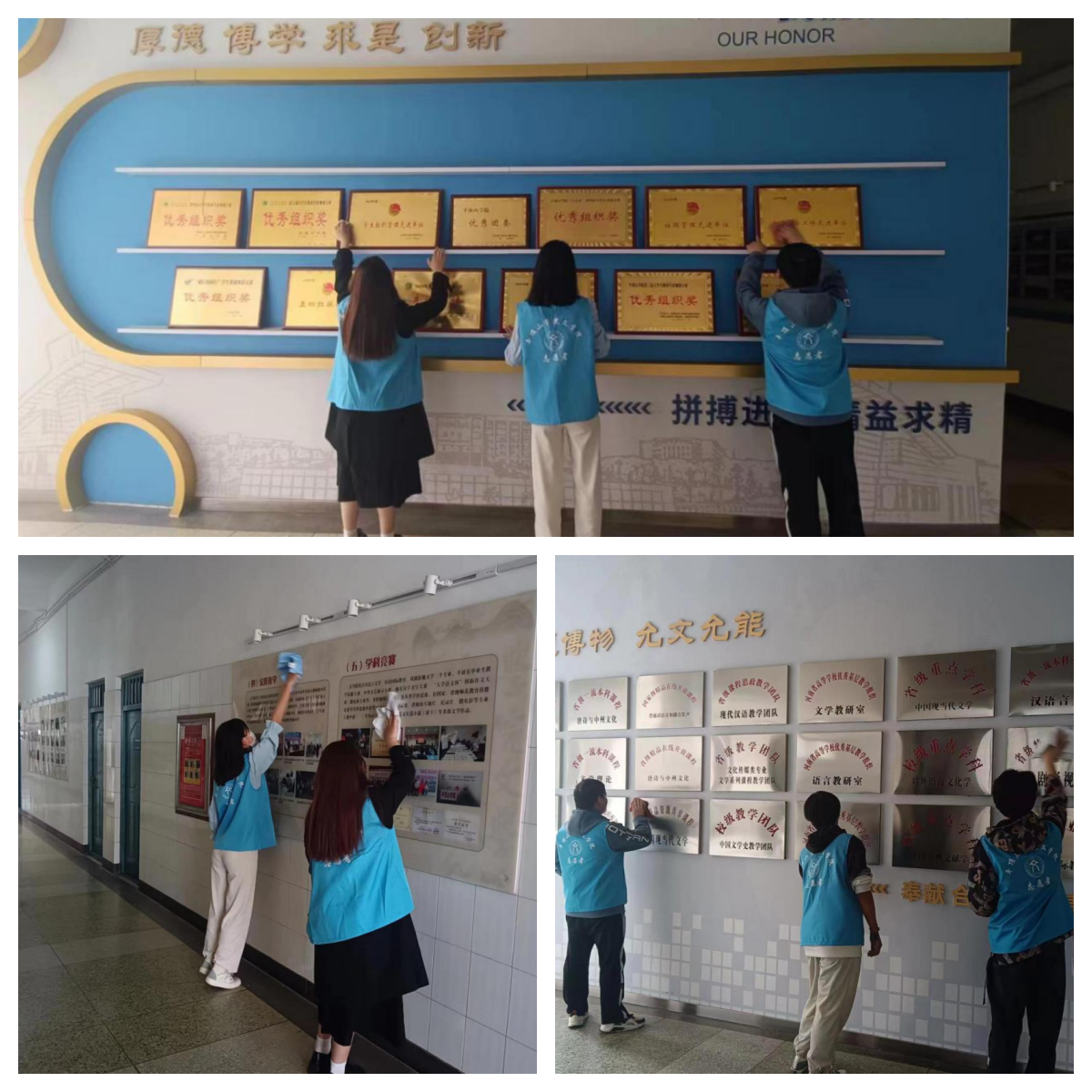 在室内,志愿者们手持抹布仔细地擦拭每一块牌板,拂去上面的灰尘,使其焕然一新。在打扫过程中,在生机盎然的春天里,同学们沉浸在劳动的喜悦中,良好的精神风貌在校园中肆意展现,志愿服务之风也在悄悄蔓延。