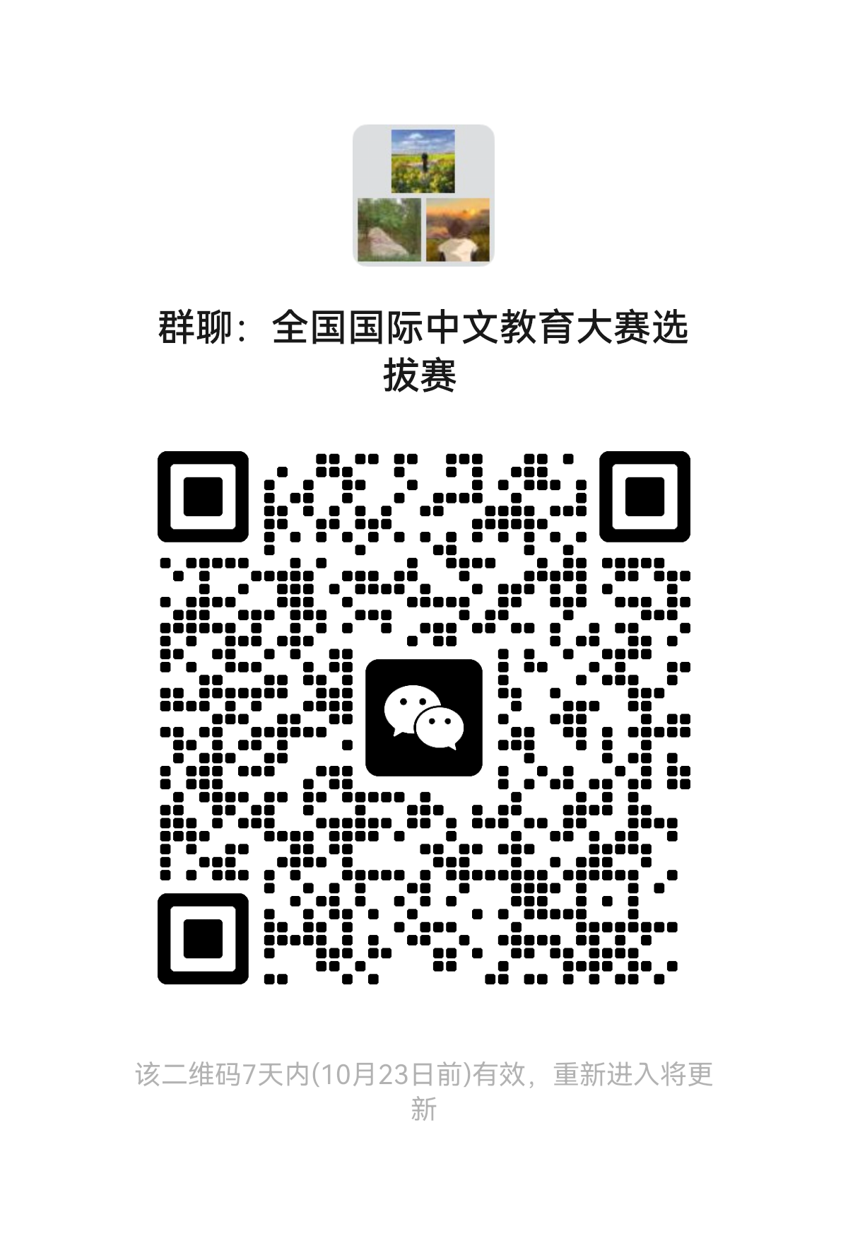 三、报名形式:有意向者请加入“全国国际中文教育大赛选拔赛”微信群(二维码见下方截图,二维码10月23日之前有效),后续通知群内发布。