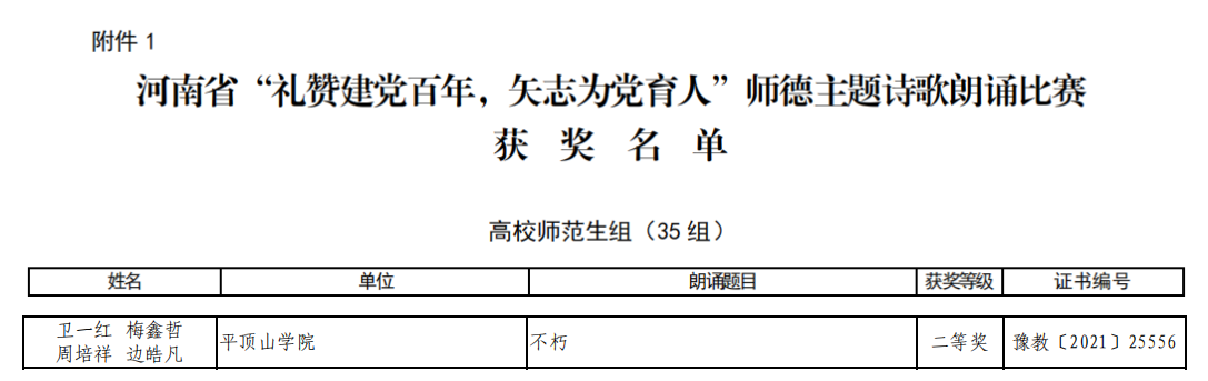 近日,河南省教育厅发布《关于公布“礼赞建党百年,矢志为党育人”诗歌朗诵比赛、师德教育主题征文和师德师风优秀案例评选结果的通知》(教师〔2021〕289 号),太阳成tyc122cc集团员工卫一红、梅鑫哲、周培祥、边皓凡的《不朽》获得河南省“礼赞建党百年,矢志为党育人”诗歌朗诵比赛高校师范生组二等奖(豫教〔2021〕25556),太阳成tyc122cc集团教师冯硕的《奶奶说》(豫教〔2021〕25601)获得河南省“礼赞建党百年,矢志为党育人”师德教育主题征文高校教师组一等奖,杜彬彬的《你把该做的事情做好》(豫教〔2021〕25704)、赵婕的《大爱无声》(豫教〔2021〕25705 )获得二等奖。