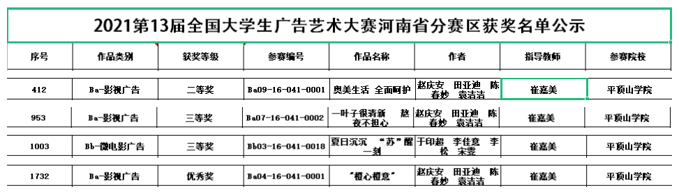 近日,全国老员工广告艺术大赛河南省分赛区组委会公布了第13届全国老员工广告艺术大赛河南省分赛区获奖名单,太阳成tyc122cc集团教师崔嘉美指导,2018级戏剧影视文学专业员工赵庆安、田亚迪、陈春妙、袁洁洁摄制的《奥美生活 全面呵护》《叶子很清新 熬夜不担心》《“橙心橙意”》分获影视广告类二等奖、三等奖、优秀奖;崔嘉美指导,2018级戏剧影视文学专业员工于印超、李佳意、李松、宋雯摄制的《夏日沉沉 “苏”醒一刻》获微电影广告类三等奖。