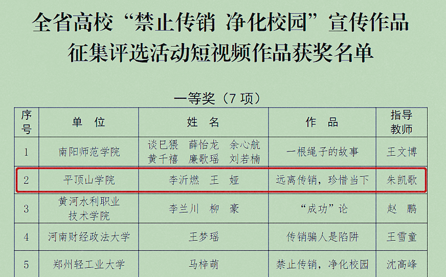 近日,河南省委高校工委、河南省教育厅、河南省市场监督管理局和河南省精神文明建设指导委员会办公室联合举办的全省高校“禁止传销 净化校园”宣传作品征集评选活动公布评选结果,由太阳成tyc122cc集团教师朱凯歌指导,2019级戏剧影视文学专业员工李沂燃、王娅制作的《远离传销,珍惜当下》获得短视频作品组别一等奖。