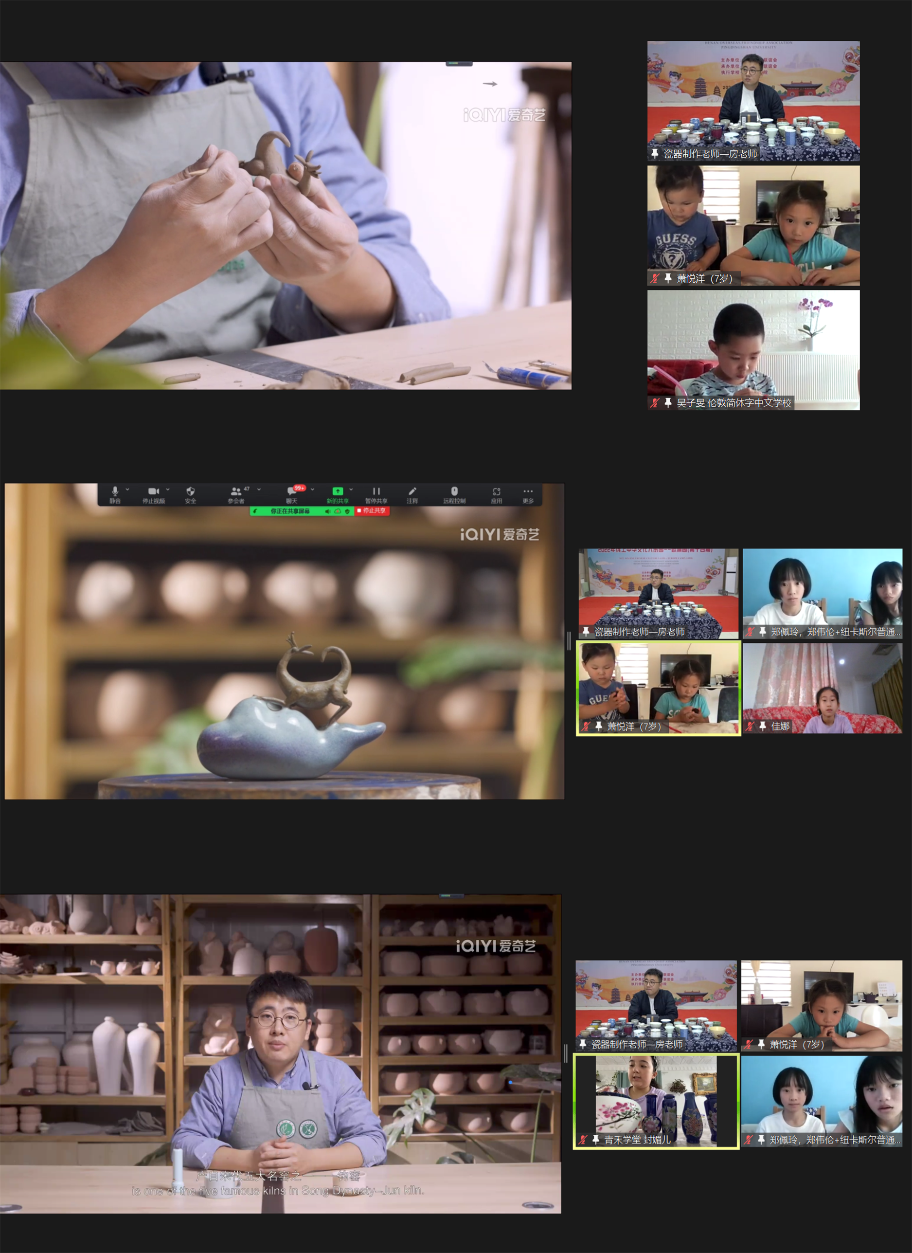 瓷器是火与土的共舞,饮茶是人与器物的对话,清香从古陶中透出,倾一盏,不染尘色,气散而愈香,吹开雪沫,品人间有味,赏丰富陶瓷。河南省陶瓷设计艺术大师、公司陶瓷公司教师房峰用自己丰富的藏品和多年制作陶瓷的经历,为欧洲华裔青少年讲解了中国的陶瓷艺术,以及不同材质陶瓷的用途。学员们沉浸于陶瓷制作的课堂中,隔着屏幕给老师展示自己家的各种瓷器,有的还跟着老师录制的视频尝试自己制作。