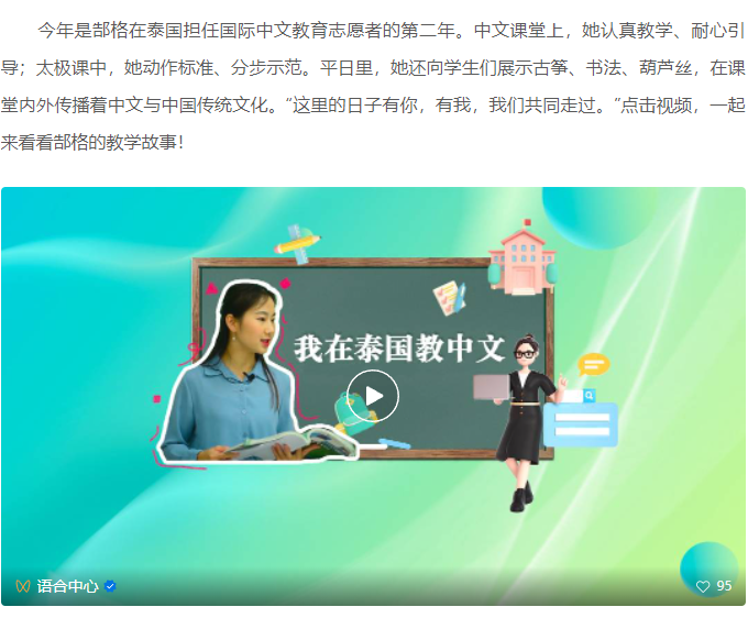 3月19日,教育部公众号《语合中心》发布了《海外教学日记 | 我在泰国教中文》微视频,用影像讲述了公司优秀毕业生郜格在泰国宋卡王子大学担任志愿者的故事。郜格除了向泰国员工们讲授汉语,还向他们展示了汉字书法书写技巧,中国古筝、葫芦丝的演奏技法,在课堂内外传播着中文与中国传统文化,用实际行动讲好中国故事。