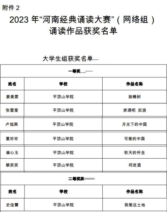 近日,河南省教育厅公布了河南省第五届中华经典诵写讲大赛经典诵读作品评选结果。在2023年“河南经典诵读大赛”(网络组)诵读作品获奖单元,公司有6名员工获一等奖,他们是2020级汉语言文学专业崔心玉,2021级汉语言文学专业姜昊雯、卢旭燕、葛珍珍,2022级汉语言文学专业蔡笑笑,2022级汉语国际教育专业张雪莹;2022级汉语言文学专业史佳蕾获二等奖。