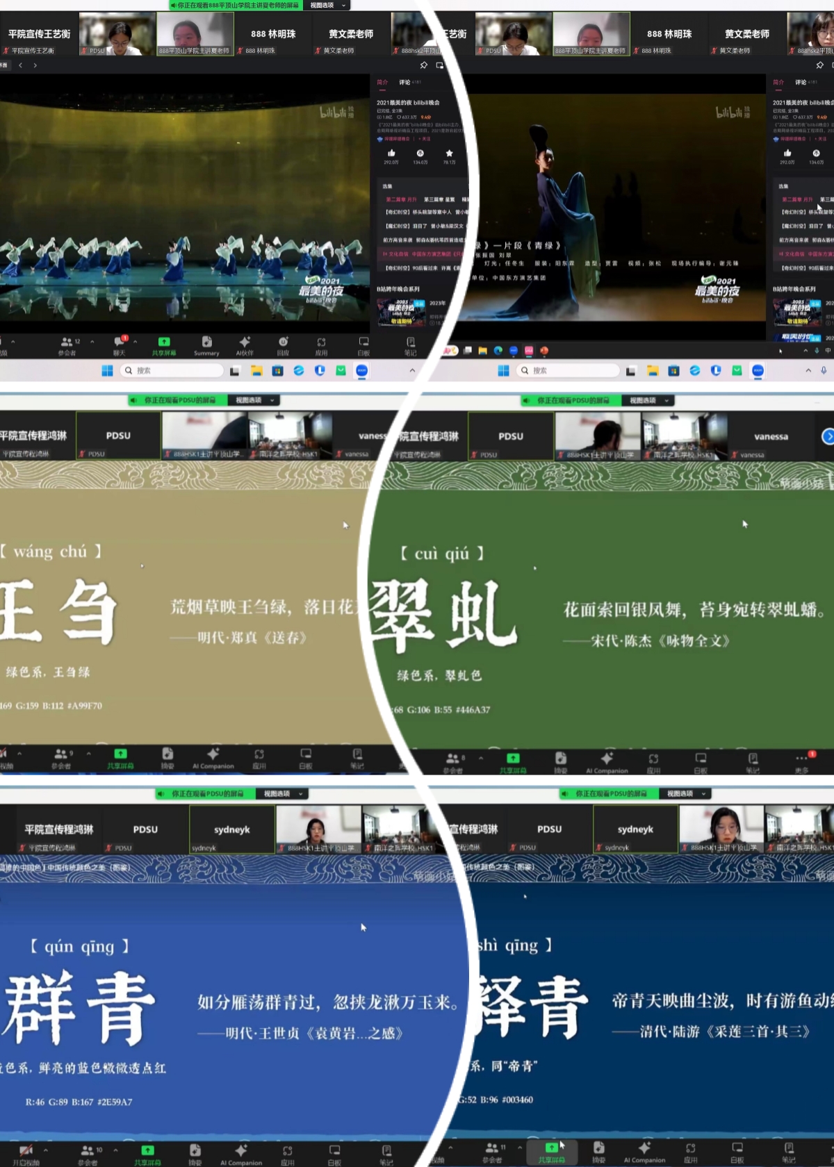 一顿一提摹五湖四海,一笔一画绘盛世蓝图。中国画历史悠久,成就辉煌。给印尼学员上课时,主讲老师为大家播放了展现中国传统美学色彩的《只此青绿》《千里江山图》等视频,结合图片介绍了中国画中蒹葭、竹月、青黛、天水碧等色彩元素。呈现“王刍”的颜色时用金黄的落叶与秋景相称,呈现“帝释青”时配以诗文“帝青天映曲尘波,时有游鱼动绿荷”,呈现“青黛”时采用岑参的“四时常作青黛色,可怜杜花不相识”作为搭配。诗句的意境美与色彩的视觉美交相辉映,一幅幅清晰灵动、流光溢彩的画面让中国传统色彩淋漓尽致地展现在学员面前,让大家感受到了中国画的缤纷灿烂。“畅游诗中画,品味画中诗”,各国学员收获了“赏心悦目”,更体验了中华优秀传统文化的博大精深与无限魅力。