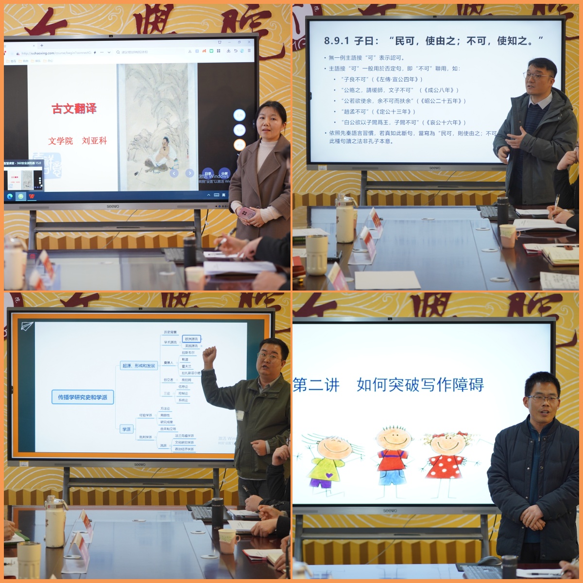 在当天的教学展示环节,刘亚科老师讲解古代汉语课程中的《古文翻译》技巧,岳上铧老师探究《论语·泰伯》中“民可使由之不可使知之”的断句异同,陈一鑫老师展示《传播学研究史和主要学派》的来龙去脉,武少辉老师展示《创意写作》中突破写作恐惧心理的方法。四位教师都以最佳状态作了教学展示,在场的专家评委以及太阳成tyc122cc集团其他教师为他们现场打分。该分数将在优质课评价、教学质量考评中进行结果运用。