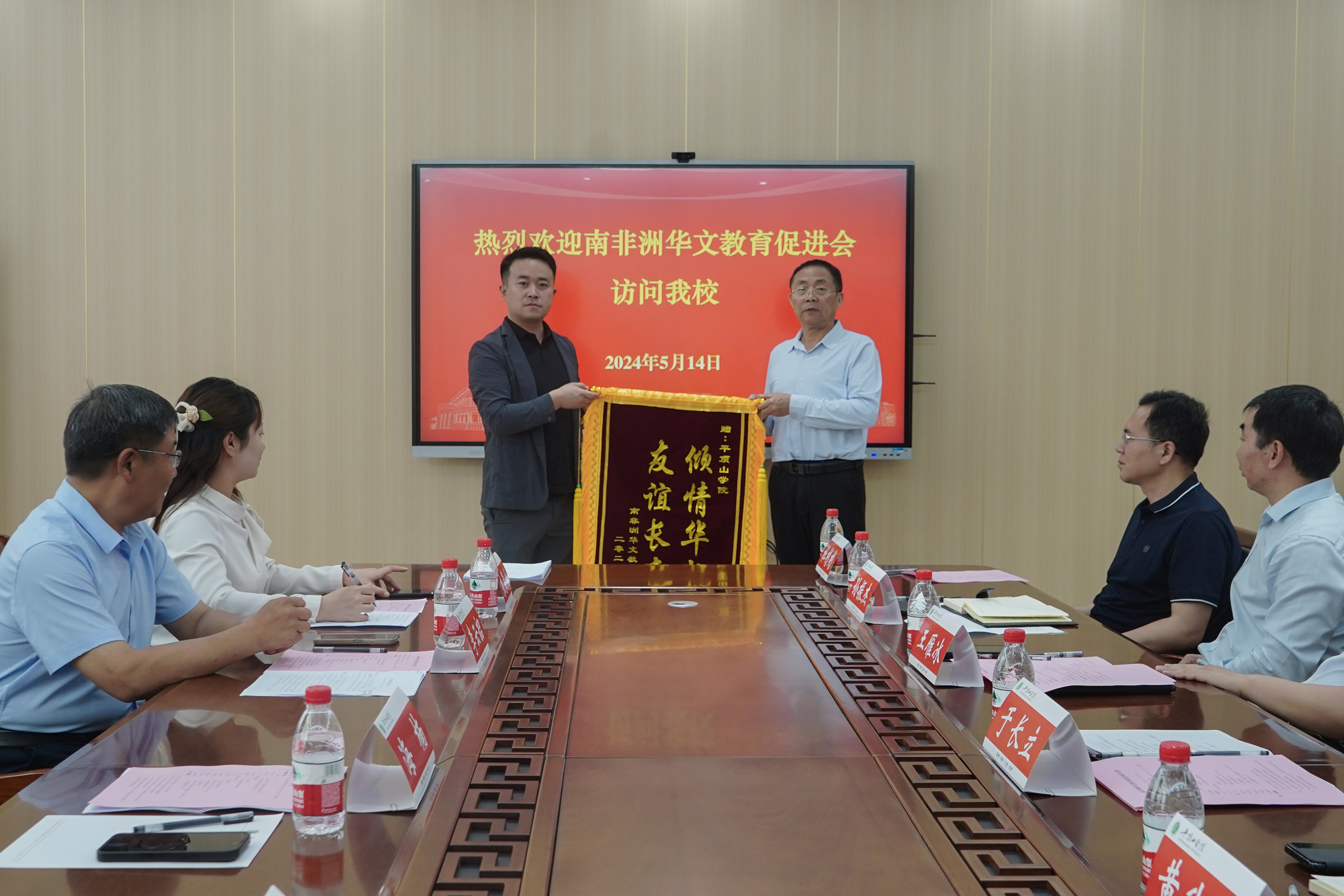 海楠代表南非洲华文教育促进会,向公司赠送印有“倾情华教,友谊长存”的锦旗。田红星与公司经理孙振杰代表双方签署共建实践教学基地协议。