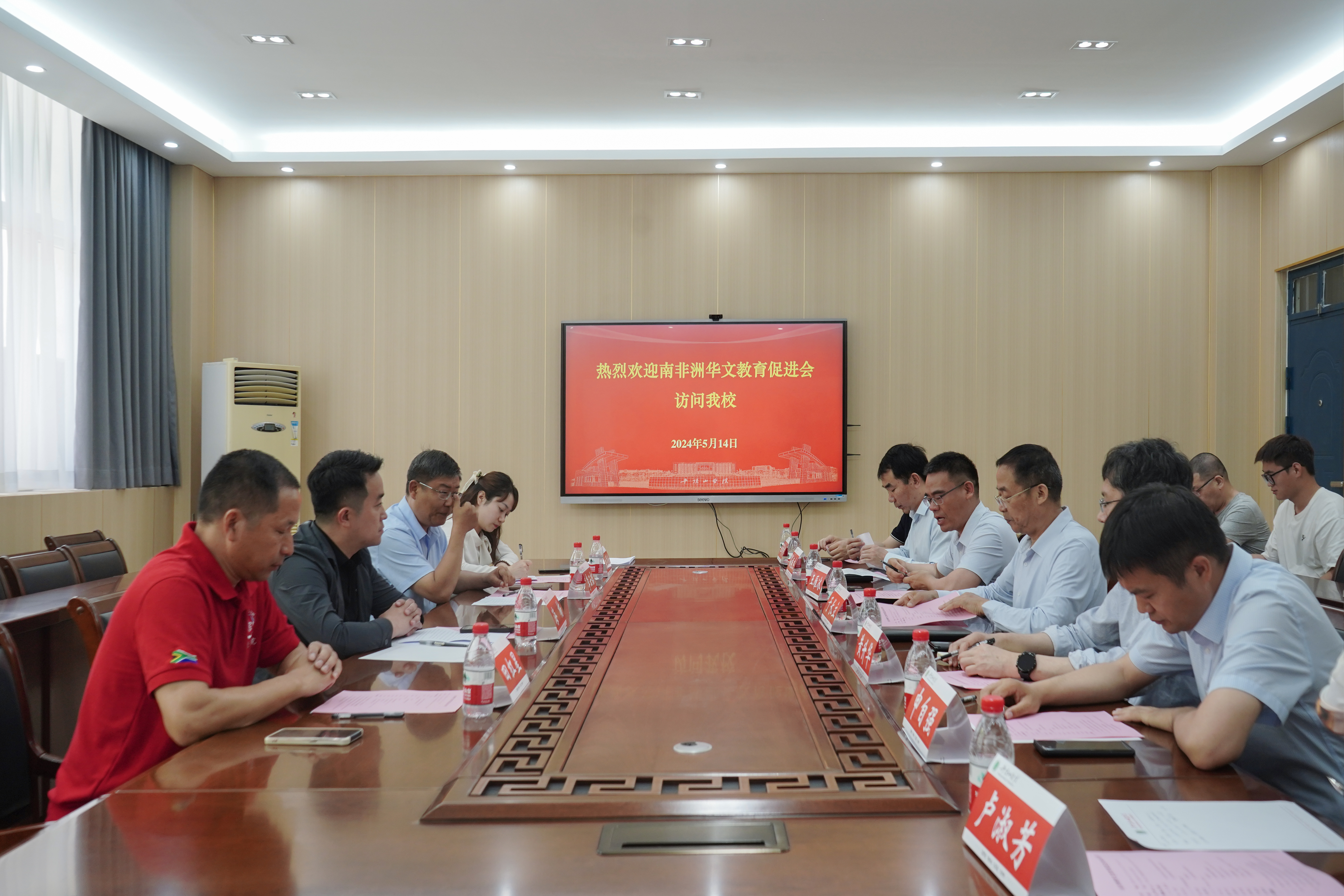 5月14日上午,南非洲华文教育促进会副会长海楠、南非树德书院教师代表田红星一行访问公司,并参加与公司共建实践教学基地签约仪式。平顶山市委统战部副部长李云韶、公司副董事长于长立,党委统战部部长黄升华,公司党委书记、经理孙振杰以及国际中文教育团队师生代表共同参加活动。仪式由国际交流与合作中心主任王雁冰主持。