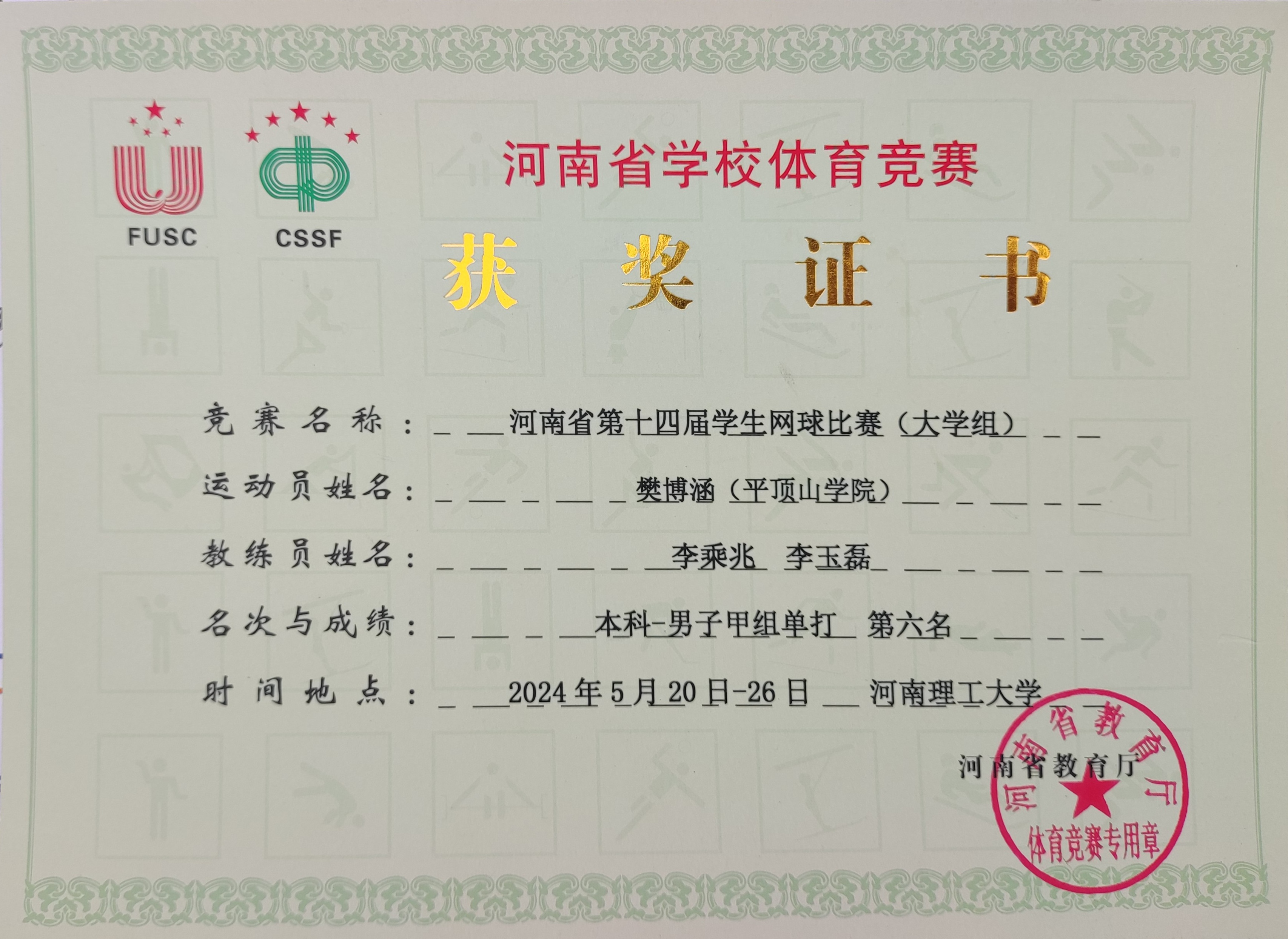 5月26日,河南省第十四届员工网球比赛在河南理工大学落幕。公司2020级汉语言文学专业员工樊博涵参赛,获得大学组第六名。