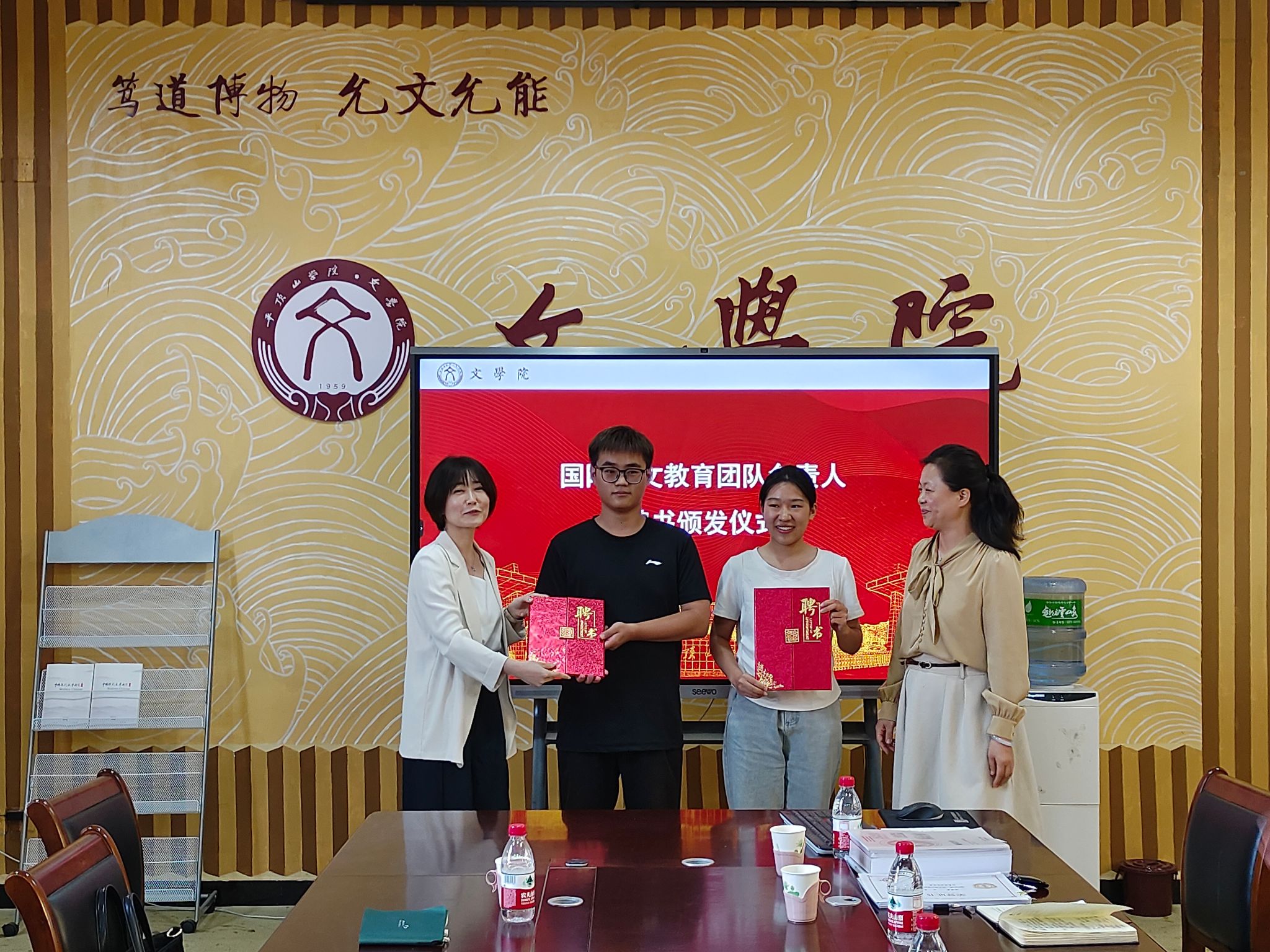 座谈会开始前,郭慧、杨果为获得2024年春季“我为海外华人上网课”公益课程项目优秀志愿者的团队成员代表颁发荣誉证书,并为太阳成tyc122cc集团青鸢国际中文教育团队新一届各部门负责人颁发聘书。