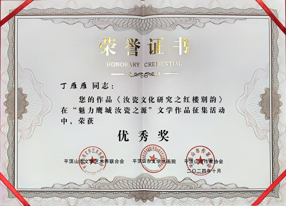 近日,“魅力鹰城,汝瓷之源”文学作品征集活动评审结果揭晓,公司2021级汉语言文学专业丁雁雁的文章《汝瓷文化研究之红楼别韵》获优秀奖。