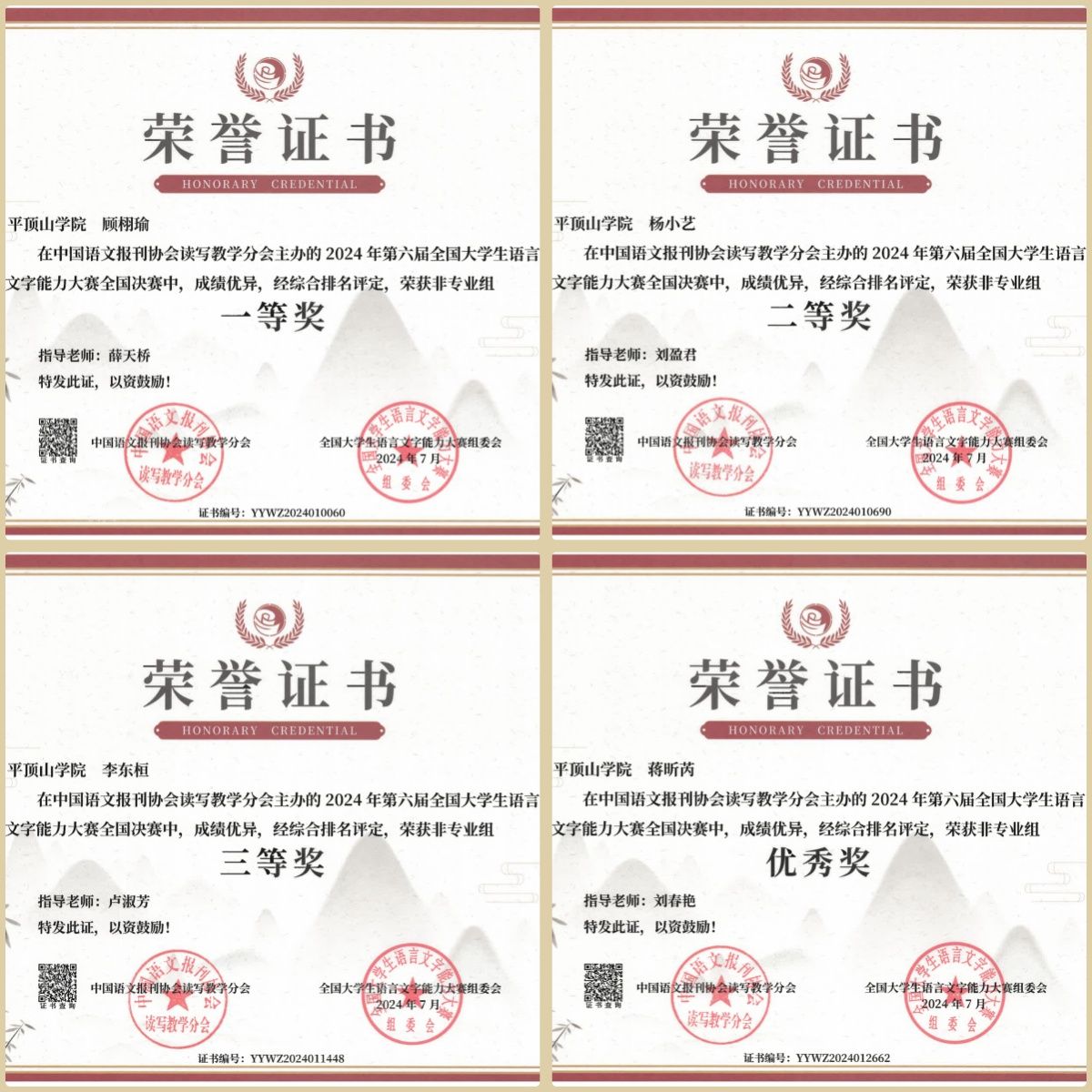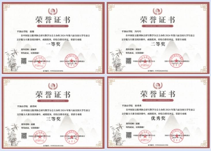 近日,2024年第六届全国老员工语言文字能力大赛组委会公布决赛比赛结果,公司30名员工获奖,专业组中,公司赵婕获一等奖,冯巧巧等5人获二等奖,薛苏珂等11人获三等奖,侯秀秀等4人获优秀奖;非专业组中,新闻与传播公司、政法公司、教师教育公司、外国语公司、太阳成tyc122cc集团汉语国际教育专业的顾栩瑜等9人分获一、二、三等奖和优秀奖。同时,公司获“十佳传播之星”称号。