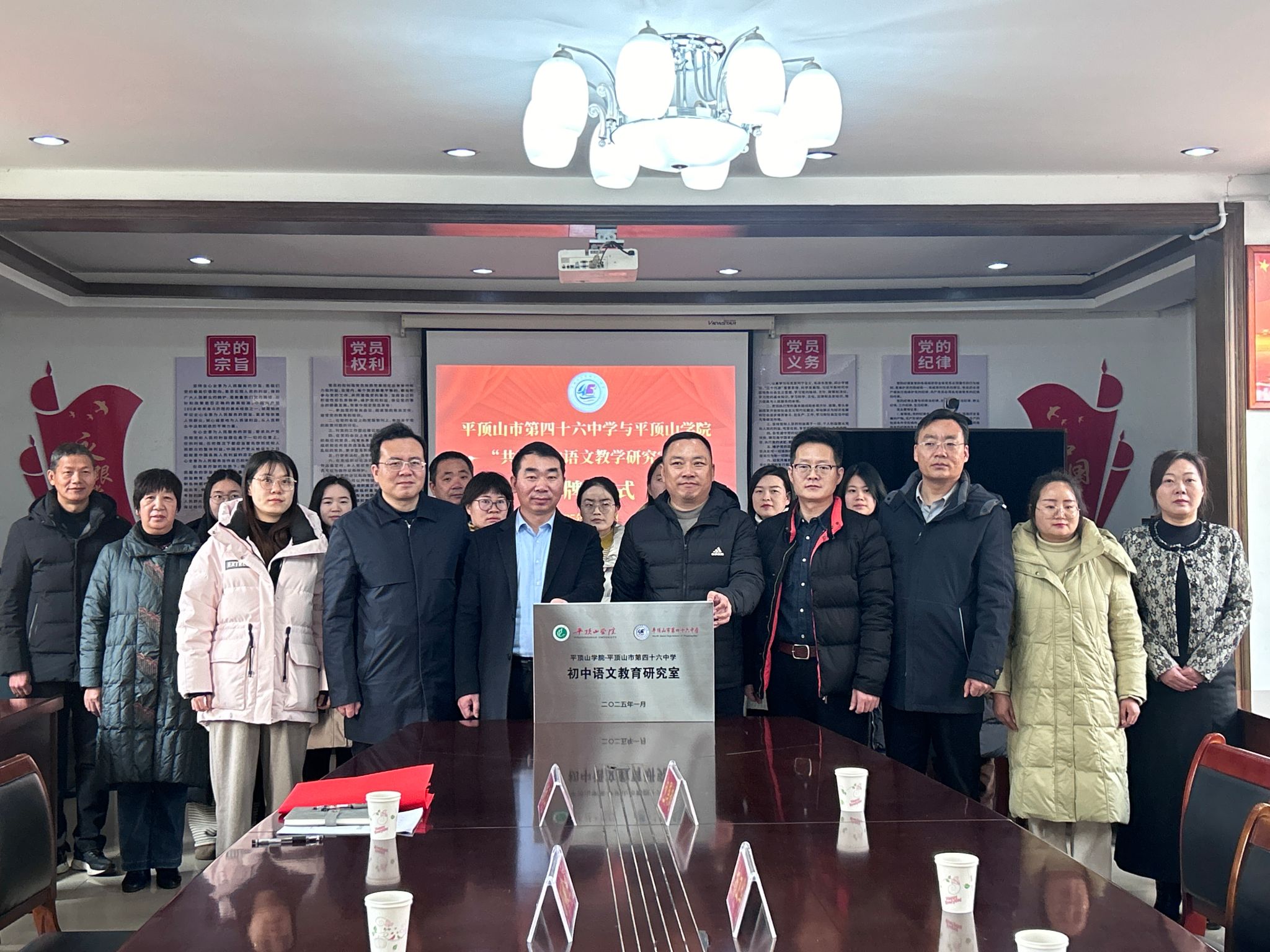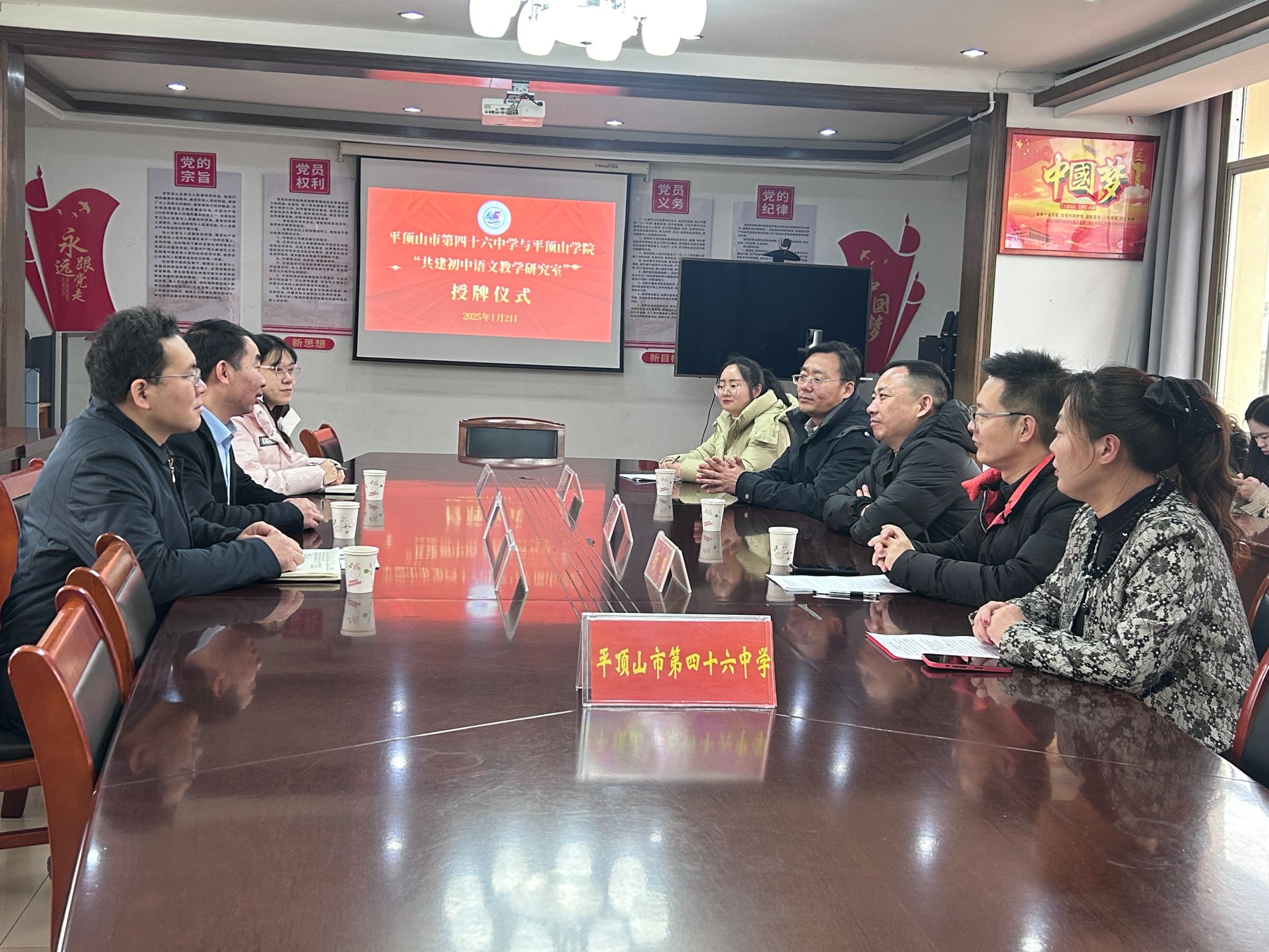 2025年1月2日,太阳成tyc122cc集团与平顶山市第四十六中学携手共建“初中语文教学研究室”的签约仪式在该校会议室举行。太阳成tyc122cc集团经理孙振杰、副经理杜彬彬、教学秘书朱玉雯,平顶山市第四十六中学党总支书记杨卫华、副书记兼董事长杨鹏、副董事长包国超及语文组教师20余人参加活动。活动由该校教科室主任周澍增主持。