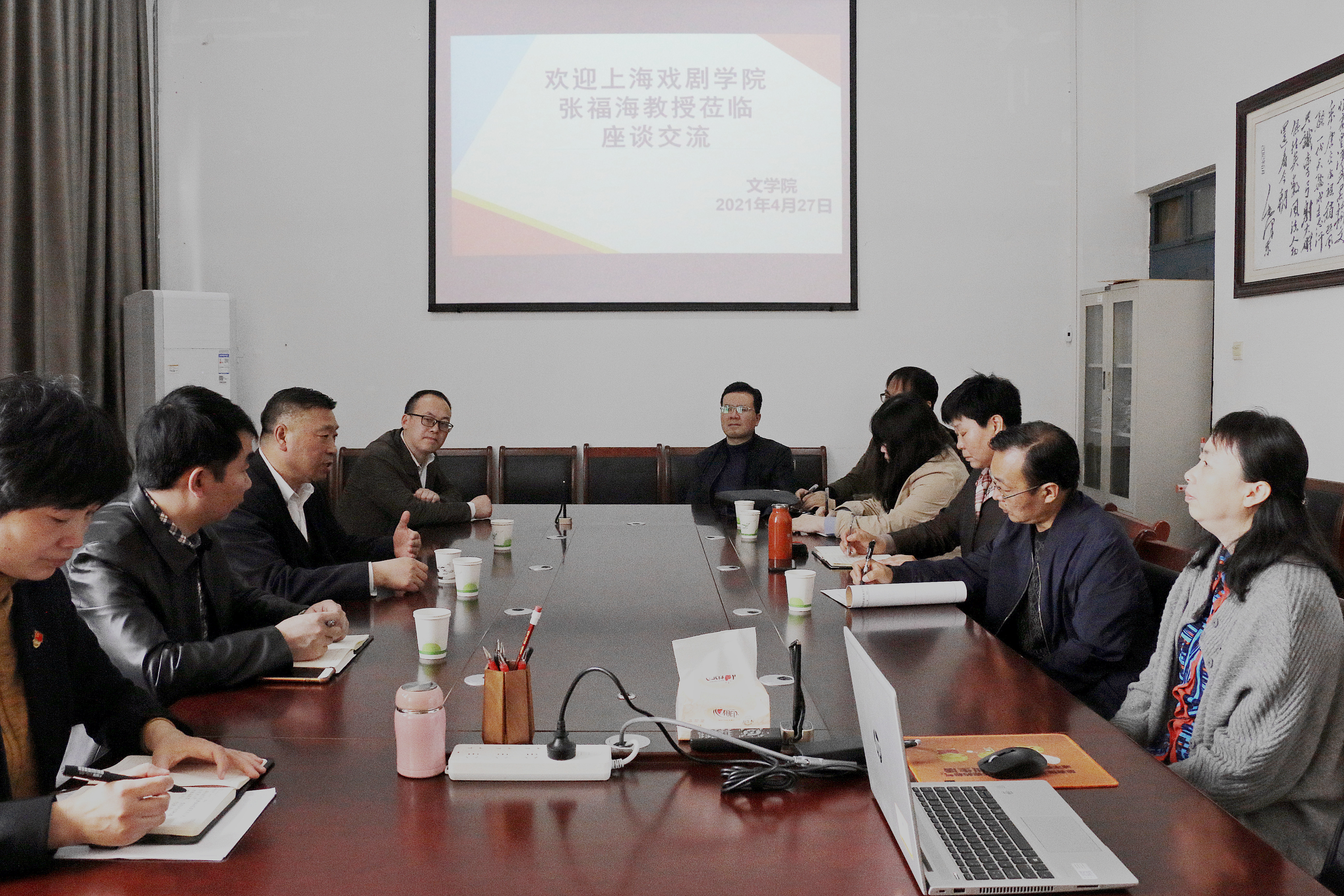 4月27日10:00,张福海教授与太阳成tyc122cc集团写作与文学理论教研室、戏剧影视文学教研室部分教师举行座谈。在座谈中,张福海与在场教师就专业建设、课程设置以及学术研究等问题进行了热烈交流,对太阳成tyc122cc集团坚持以创作为实践教学方向的做法提出了中肯的建议。