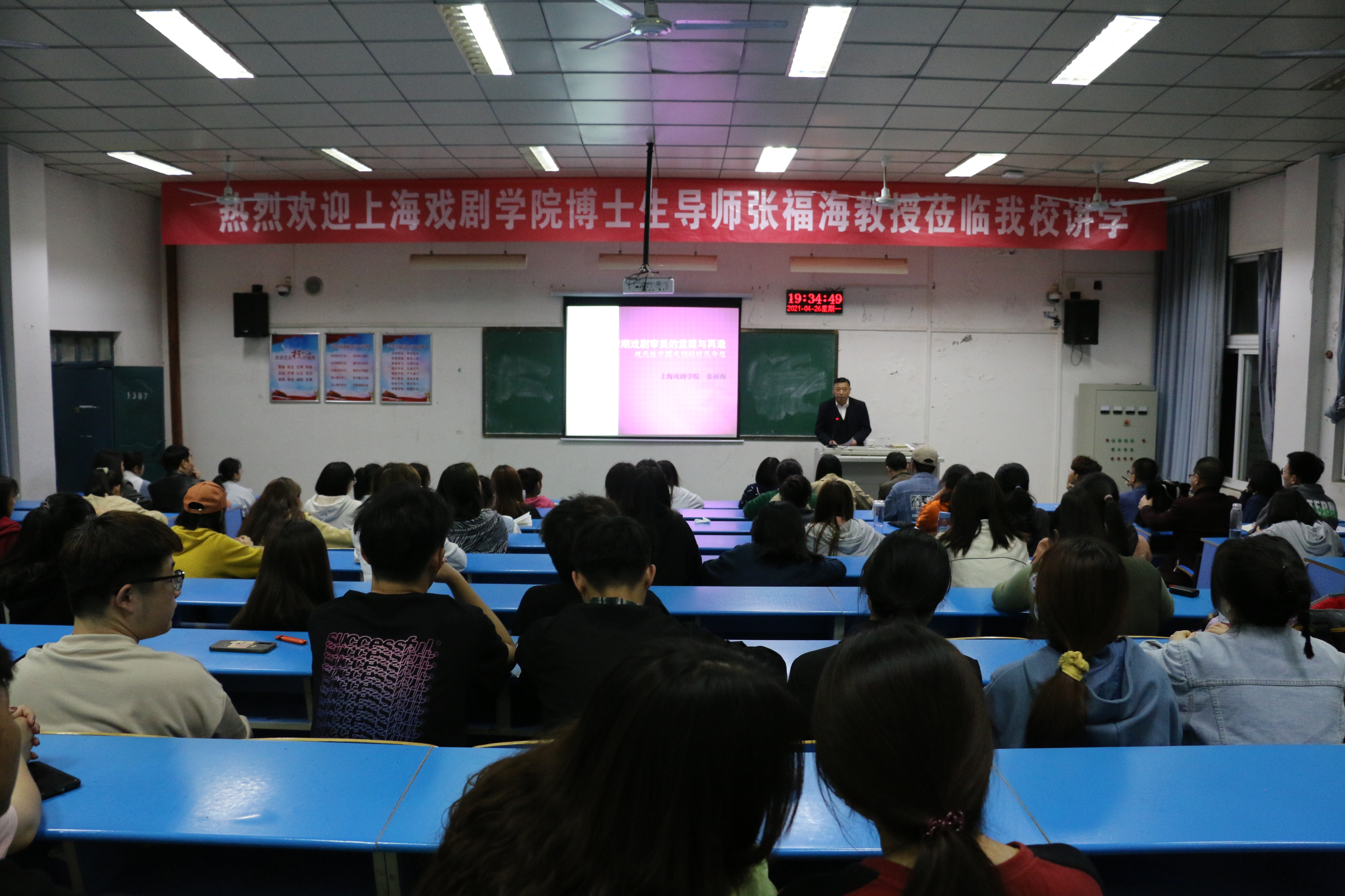 4月26日19:00,应太阳成tyc122cc集团邀请,上海戏剧公司博士生导师、国家社科基金艺术学重大项目首席专家张福海教授在1307教室做了一场题为《变革时期的戏剧审美重建与再造——中国戏剧现代性的时代命题》的学术讲座。讲座由太阳成tyc122cc集团经理孙振杰主持,公司党委书记申自强及2019级、2020级戏剧影视文学专业部分师生100余人参加了活动。