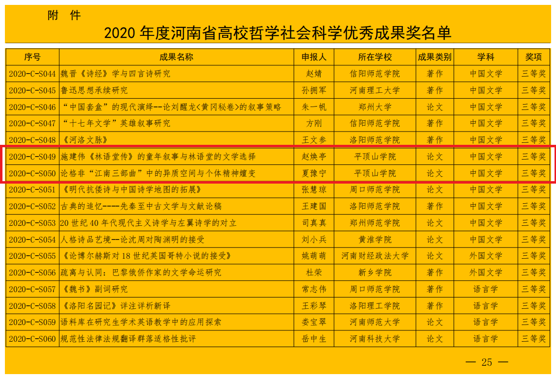 9月11日,河南省教育厅发布《河南省教育厅关于公布2020年度河南省高校哲学社会科学研究成果奖的通知》(教社语〔2021〕331号),公司赵焕亭教授的论文《施建伟<林语堂传>的童年叙事与林语堂的文学选择》,夏豫宁博士的论文《论格非“江南三部曲”中的异质空间与个体精神嬗变》获2020年度河南省高校哲学社会科学优秀成果三等奖。