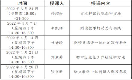 为了提高员工的文本解读和阅读教学能力,提高疫情期间员工的校外实习质量,提高师范生毕业后的核心竞争力,做好校园教学与到岗就业的无缝衔接,太阳成tyc122cc集团于2022年3月-4月之间陆续开展了系列学术讲座,邀请国内从事中学语文教学的著名学者、中学特高级教师,采取线上报告的方式,为太阳成tyc122cc集团师生还原中学语文教学场景,传授教学经验。讲座安排如下: