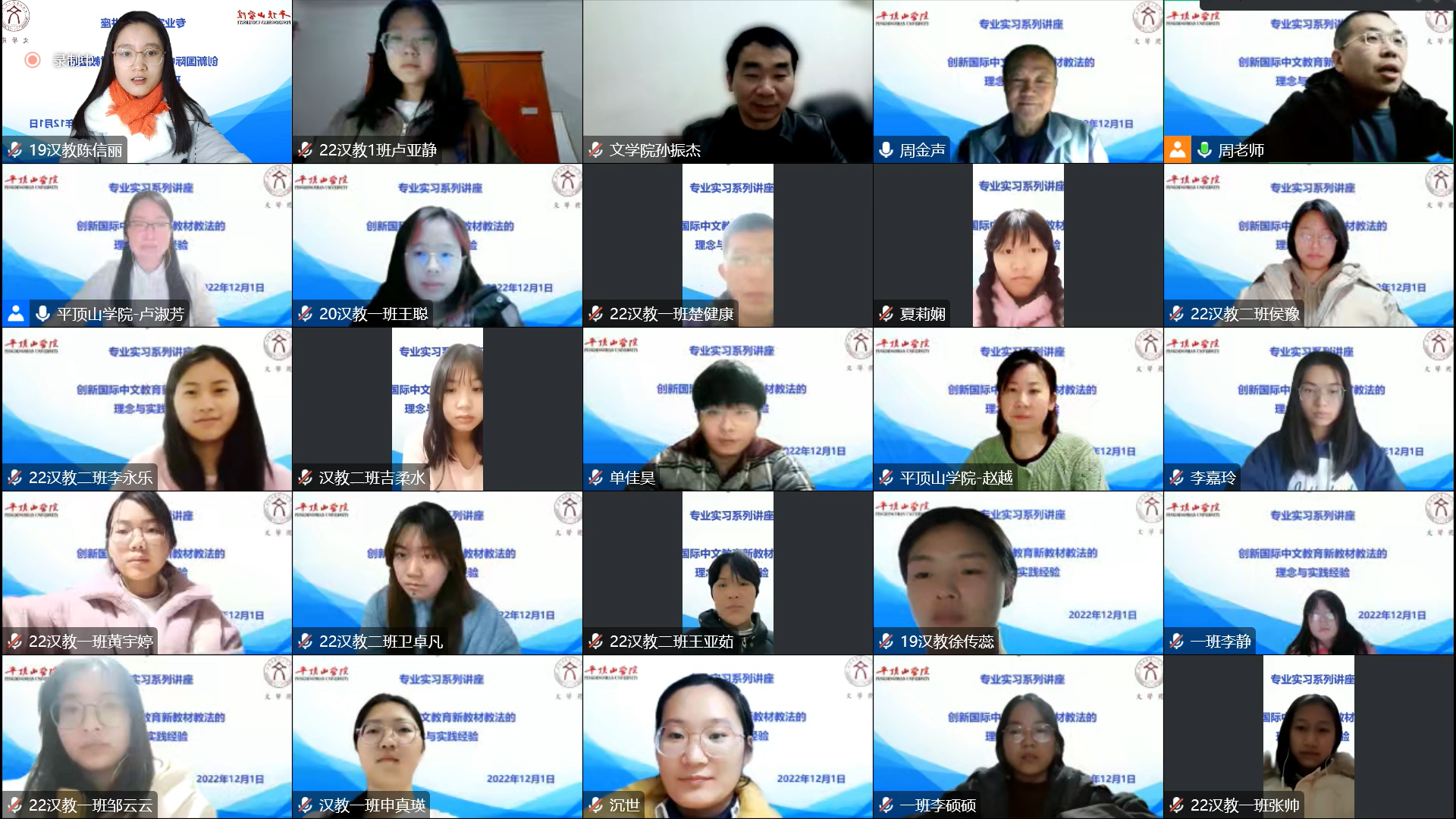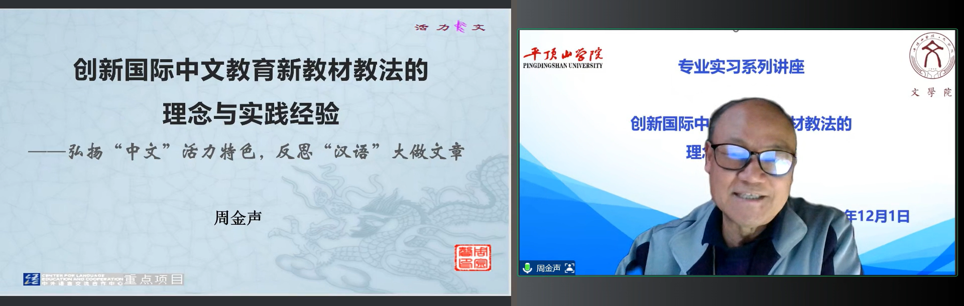 12月1日晚,太阳成tyc122cc集团专业实习系列讲座第四场在腾讯会议举行,喀什大学特聘教授周金声作了题为《创新国际中文教育新教材教法的理念与实践经验》的报告,太阳成tyc122cc集团语言教研室全体教师,汉语国际教育专业四个年级200余名员工线上参加了报告会。报告会由语言教研室主任卢淑芳主持。