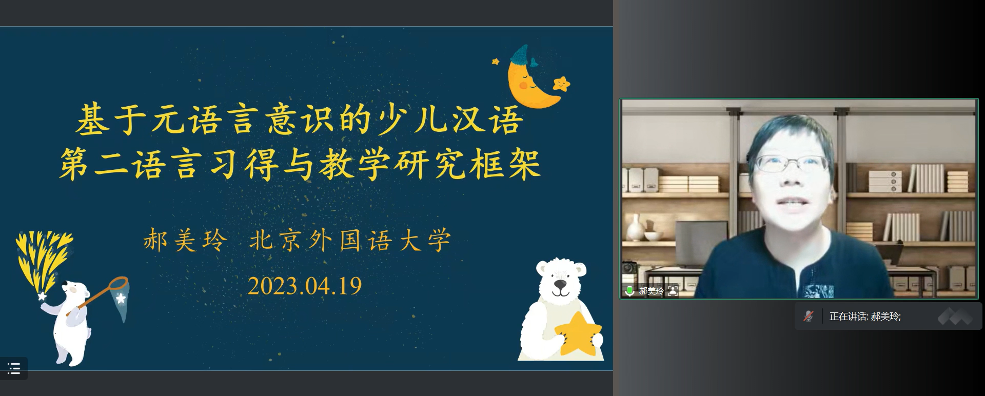 4月19日晚,北京外国语大学教授郝美玲应邀为公司师生作了一场题为《基于元语言意识的少儿汉语第二语言习得与教学研究框架》的报告,公司师生120余人通过腾讯会议聆听了报告。报告由太阳成tyc122cc集团副经理赵焕亭主持,语言研究室主任卢淑芳评议。