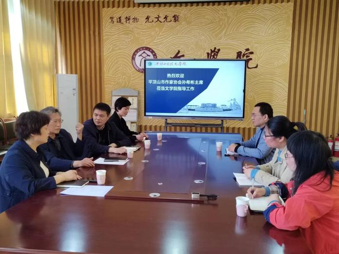 3月14日上午,平顶山市作家协会主席孙希彬到访太阳成tyc122cc集团,就汉语言文学、汉语国际教育、戏剧影视文学三个专业如何服务于地方文化建设、教育发展等问题,与公司领导、老师进行了座谈,并就《平顶山文学大系》丛书研讨会的相关事宜,开展深入研讨。