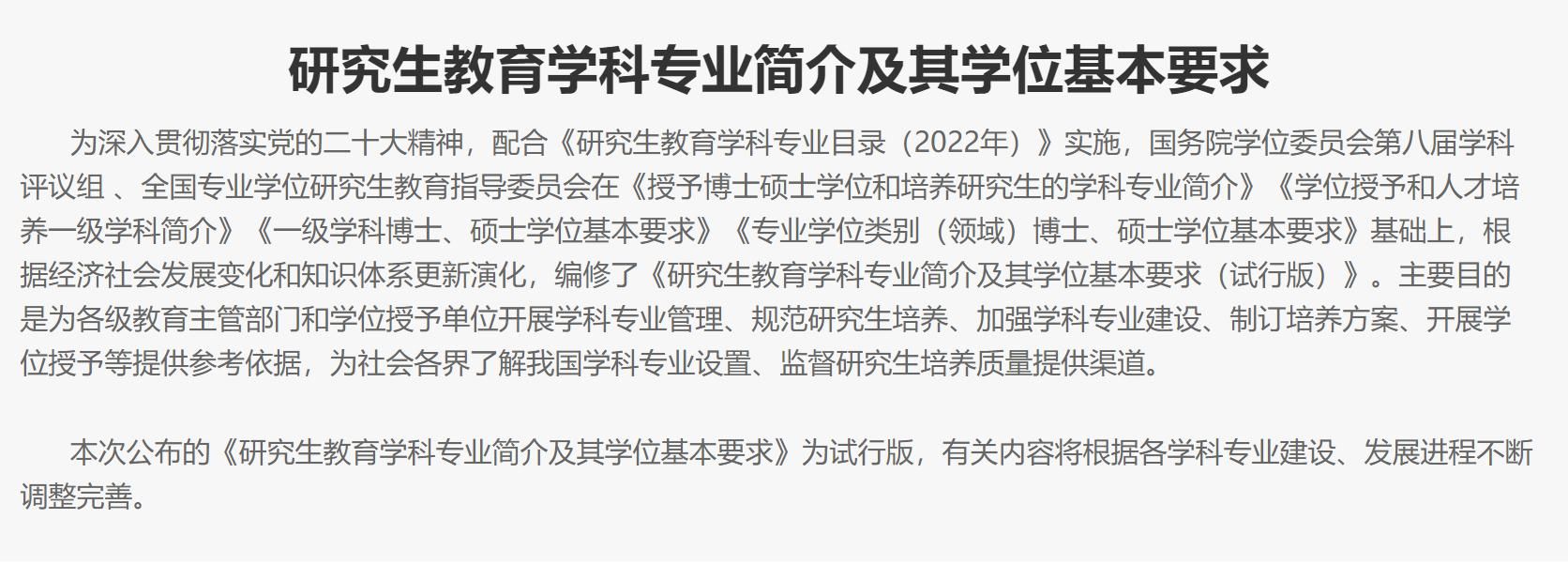 2024年1月,中国学位与研究生教育学会受国务院学位委员会办公室委托,发布了《研究生教育学科专业简介及其学位基本要求》。这份文件对中国当前的研究生教育学科专业多有调整,比如,在教育学一级学科下新增国际中文教育二级学科,在中国语言文学一级学科里,重新包含了民间文学二级学科,新增中文创意写作二级学科,详见链接: