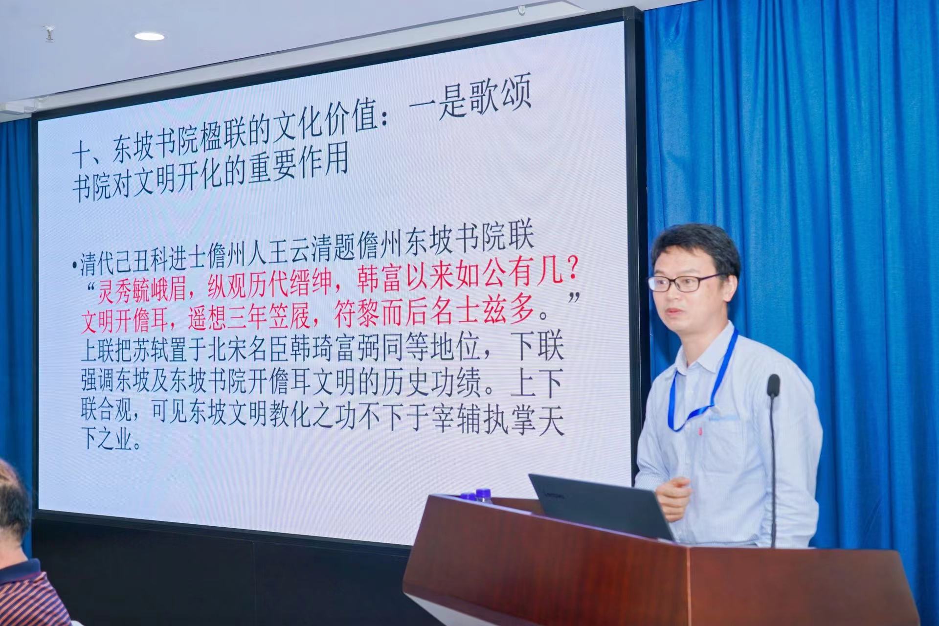 当天下午,大会进入分论坛小组讨论环节,沈喜阳老师在第一组发言。沈喜阳博士指出,苏东坡是一座取之不尽用之不竭的文化宝藏。全国各地东坡书院的楹联,则是以楹联的形式来评说东坡。通过楹联评说苏东坡,是中国文化人继通过诗词文赋评说苏东坡之外的另一精巧而独到的评说方式。沈喜阳博士从全国各地东坡书院楹联来展示后人心目中的东坡形象和东坡精神,为苏轼形象研究和东坡文化传播另辟蹊径。他认为,我国目前共有四类东坡书院,古已有之今仍兴盛的东坡书院、名存实亡的东坡书院、古已有之而今天修葺重光的东坡书院、挂靠在高等公司的东坡书院。他重点强调了全国各地东坡书院楹联的四个特征:一是切合书院时地特点,二是化用东坡故实轶事,三是展现作者胸襟识见,四是表达万民敬仰情感。他概括出全国东坡书院楹联的四个文化价值,一是歌颂书院对文明开化的重要作用,二是把崇仰东坡与传承文明相结合,三是劝学励志,期望士子勤勉向学追踪昔贤,四是提倡文化价值高于朝廷浮华。他最后指出,探究全国各地东坡书院楹联的文化价值,能进一步提升东坡书院知名度,弘扬东坡文化精神。