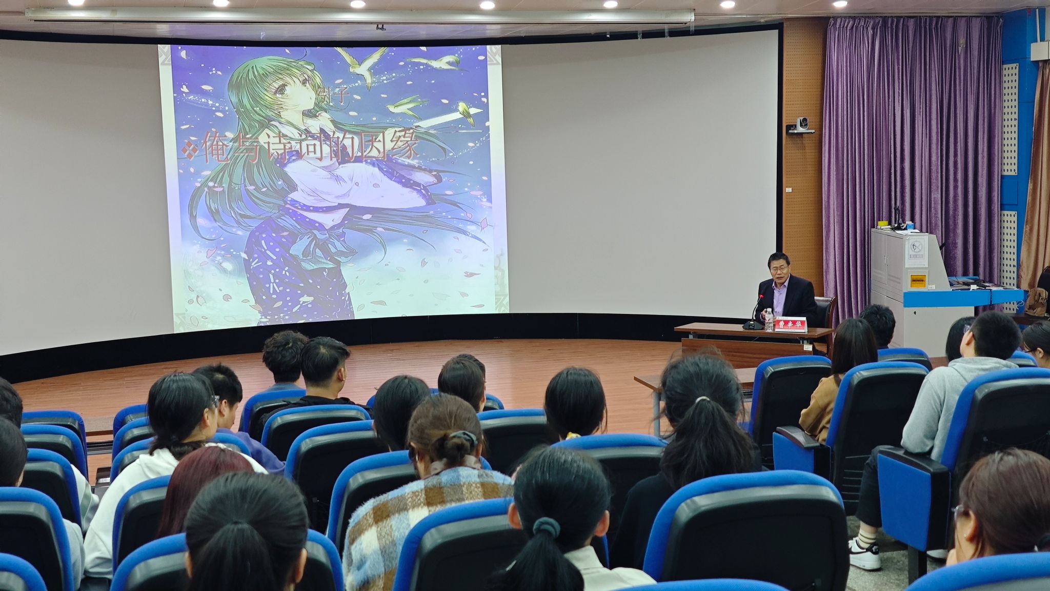 报告中,曹辛华教授以个人成长的四个阶段:小学、高中、大学、博士及博士后阶段为主线,生动讲述了他与唐宋诗词的“结缘史”。他以不同的腔调,现场吟诵了杜甫的《登高》《月夜忆舍弟》等作品,向同学们阐释了诗词来源于音乐、服务于音乐的本质。他强调,文学创作和研究分别是加密和解码的过程,大家可以通过这些“陌生化”的过程排遣自己的忧郁,获得新生的力量。曹辛华教授提倡“新格律诗”的创作,他指出,所谓“新格律诗”,即按照唐宋诗词体制生成原理,依照当前现有的流行歌曲的乐曲形式或歌词形式来重新填制的歌词。他重点讲解了“声诗”,借用现当代流行歌曲《最远的你是我最近的爱》《东方之珠》等的曲调现场演唱了自己创作的新歌词。他告诫同学们要尝试着写诗词歌赋配乐演绎,用诗词文字与旋律的有机结合巧妙表达内心世界。报告结束后,曹辛华教授与同学们进行互动交流,对同学们的提问给予详细解答。