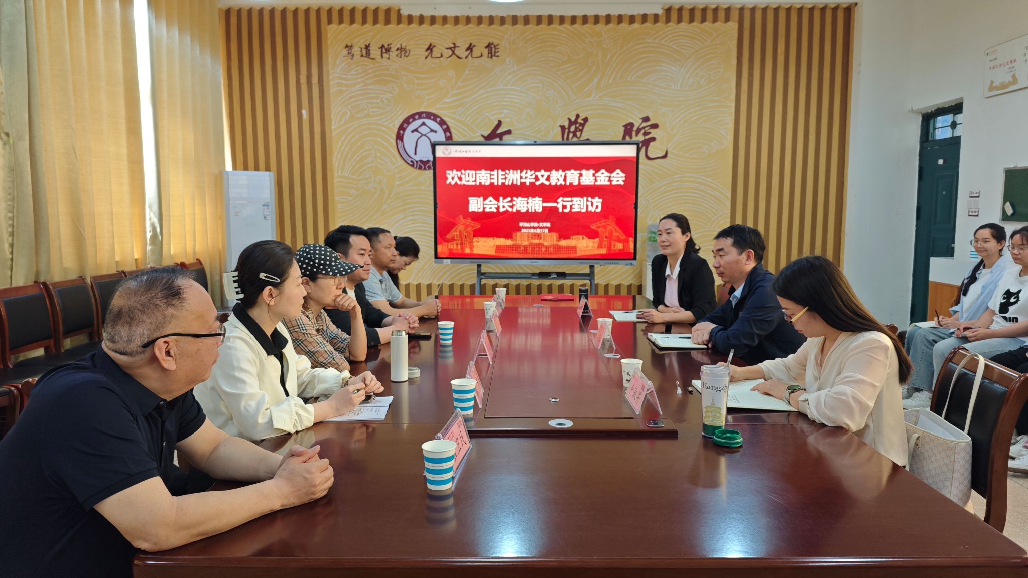 4月17日上午,南非洲华文教育基金会副会长海楠一行到访公司,并与公司师生举行座谈。平顶山市人民政府侨务办公室侨务综合科科长郭慧、侨务事务科科长杨果,南非树德书院离任国际中文教师田红星、候任教师李斌,公司经理孙振杰、国际中文教育教研室主任卢淑芳及青鸢国际中文教育团队南非教学组成员参加座谈会。会议由太阳成tyc122cc集团副经理王惠主持。