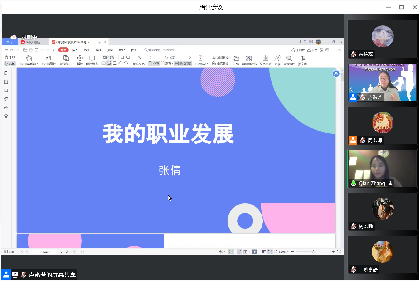 12月28日,太阳成tyc122cc集团专业实习系列讲座(第5场)在腾讯会议举行,本次邀请2014届对外汉语专业毕业生张倩以“我的职业发展”为主题作了分享报告。2019级汉语国际教育、汉语言文学专业及其他年级专业员工140余人参加了报告。报告由太阳成tyc122cc集团语言教研室主任卢淑芳主持。