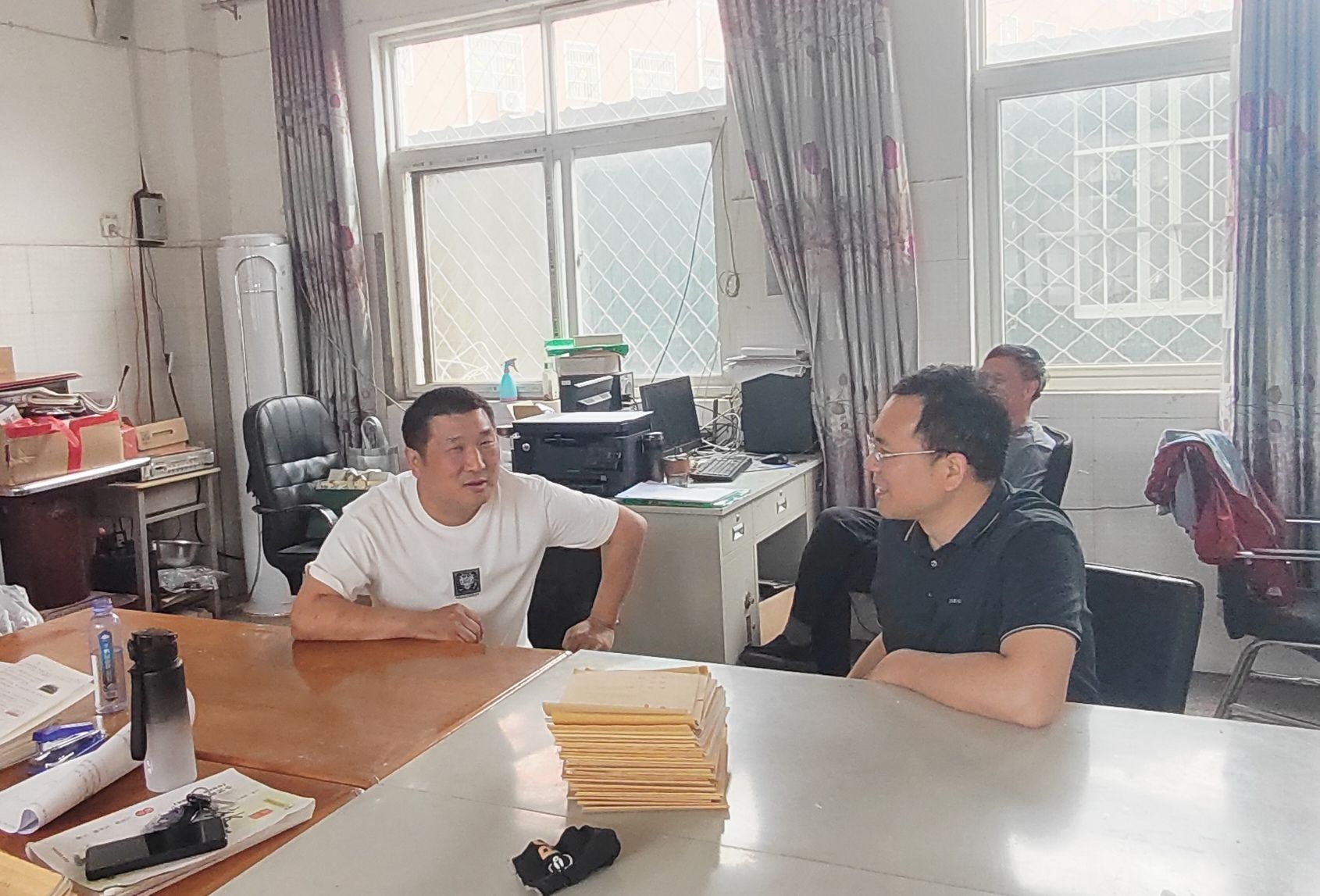 杜彬彬与范盈超员工在交谈