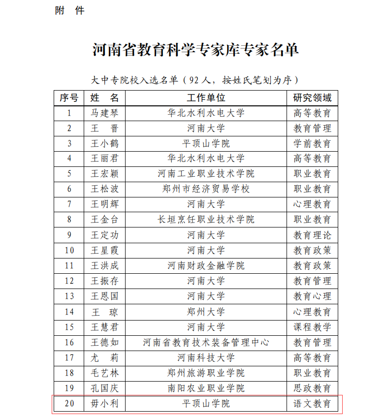 此次河南省教育科学专家库专家遴选工作旨在挖掘广大教育科学专家的聪明才智,充分发挥他们在教育改革发展中的学术引领和资政育人作用,带领全省教育工作者强化责任担当,献身教育事业,为我省教育高质量发展作出积极贡献。据悉,教育科学专家库由河南省教育科学规划领导小组办公室统筹管理,根据专家工作业绩和学术诚信进行动态评价,逐步建立常态化补充完善和退出机制。经组织第三方专家评审,共确定125位同志(大中专院校92人,中小学幼儿园33人)为河南省教育科学专家库专家。