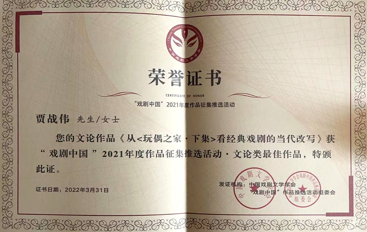 近日,“戏剧中国”2021年度作品征集推选活动证书颁发仪式及2021年度优秀剧目线上展演证书颁发礼在山东省济南市章丘区石匣村举行,太阳成tyc122cc集团教师贾战伟的文论作品《从<玩偶之家·下集>看经典戏剧的当代改写》获评文论类最佳作品。