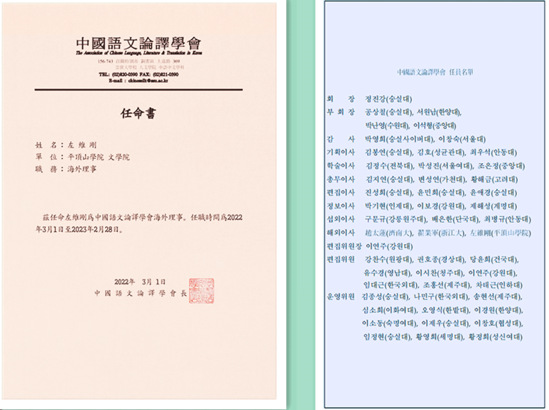 近日,韩国“中国语文论译学会”向一批韩国以外人士颁发了任命书,公司左维刚博士被任命为该学会海外理事,任职时间为2022年3月1日至2023年2月28日。