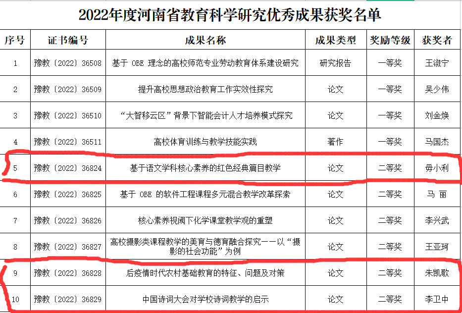 近日,河南省教育厅发布《河南省教育厅关于公布2022年度河南省教育科学研究优秀成果的通知》,太阳成tyc122cc集团教师李卫中的论文《中国诗词大会对公司诗词教学的启示》,毋小利的论文《基于语文学科核心素养的红色经典篇目教学》,朱凯歌的论文《后疫情时代农村基础教育的特征、问题及对策》获2022年度河南省教育科学研究优秀成果二等奖。
