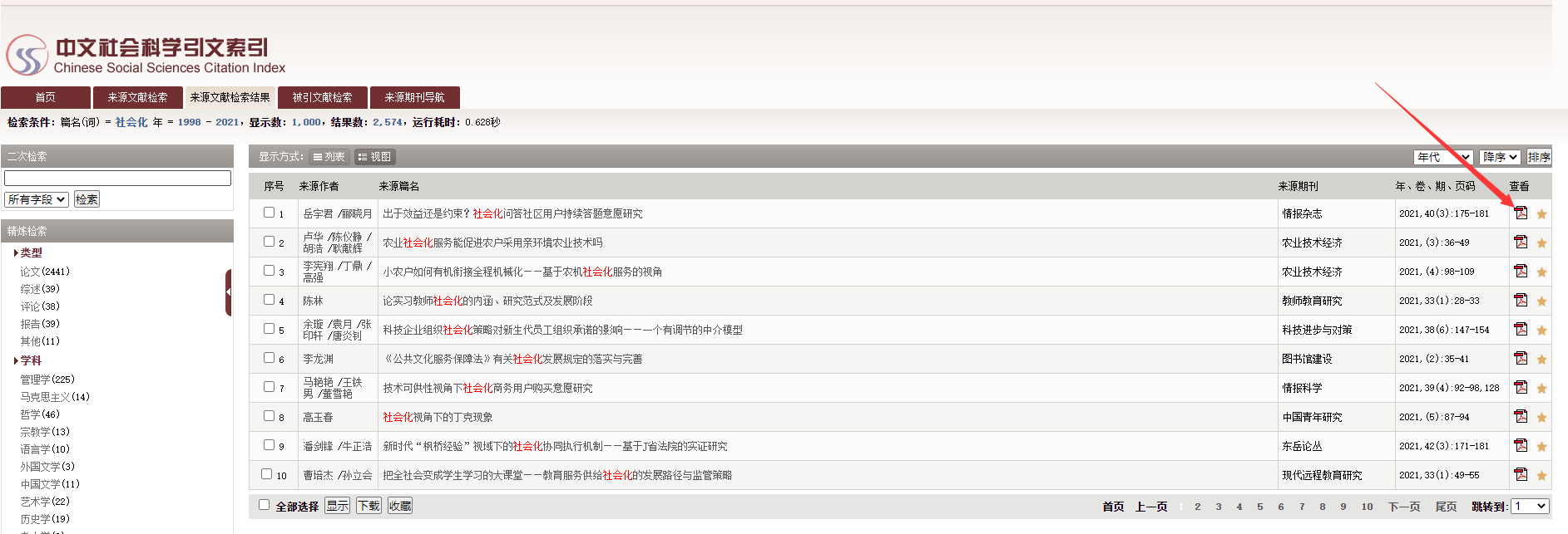 进入CSSCI数据库(http://cssci.nju.edu.cn)来源文献检索页面,输入需要检索的关键词、篇名、作者、期刊名称等。
