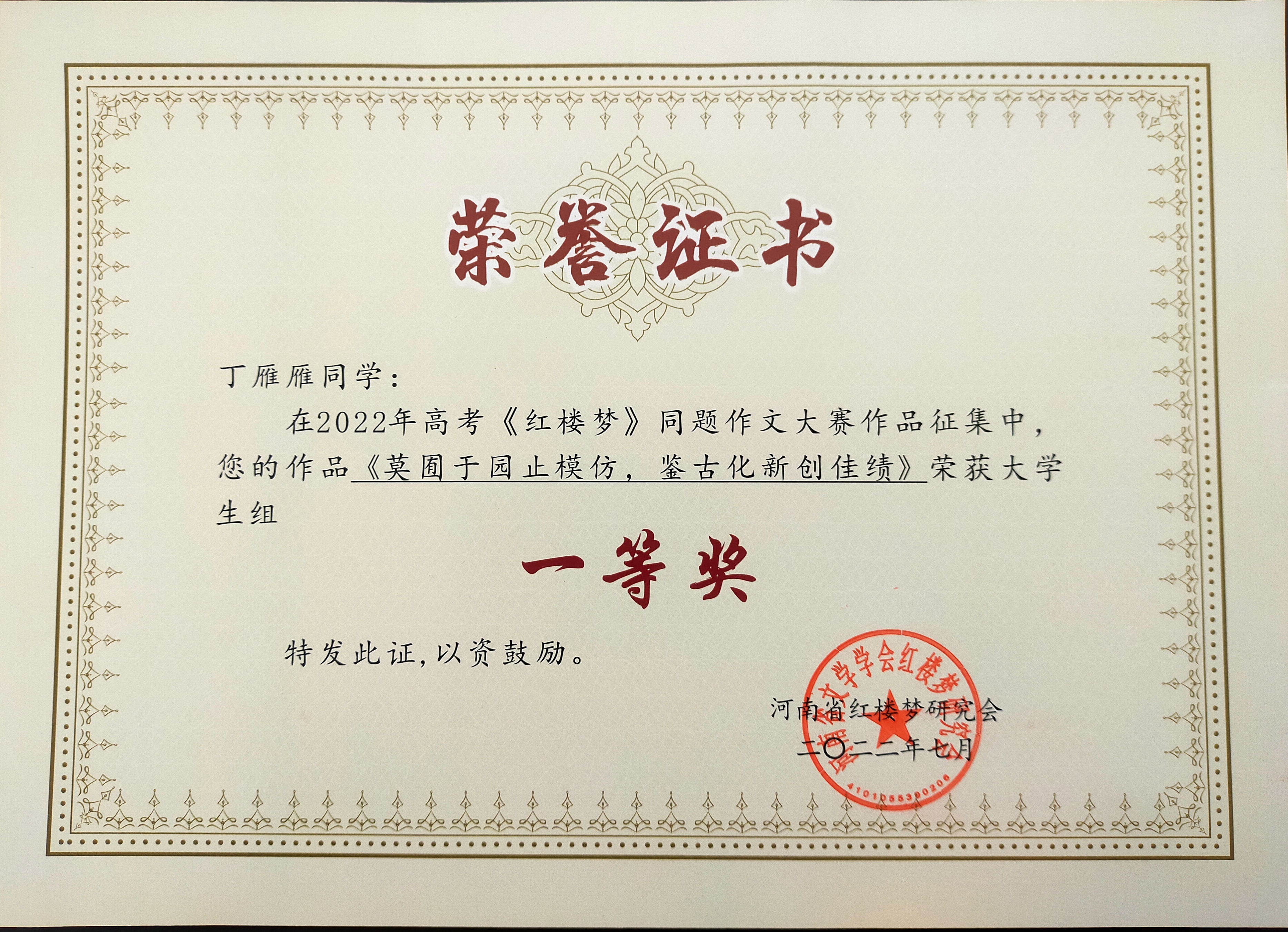 近日,由河南省红楼梦研究会主办,河南日报传媒公司、大河网、洛阳客家文化旅游公司、河南省电子商务协会协办的2022高考红楼梦同题作文大赛落下帷幕。在本次大赛中,公司2021级汉语言文学专业员工丁雁雁获老员工组一等奖,2021级汉语国际教育专业员工夏怡晴、2020级汉语言文学专业员工刘书昊、信息工程公司2021级电子信息工程(中外)专业员工张梓硕获老员工组三等奖。太阳成tyc122cc集团赵焕亭、李东晓、陈思洁三位教师获组织奖。