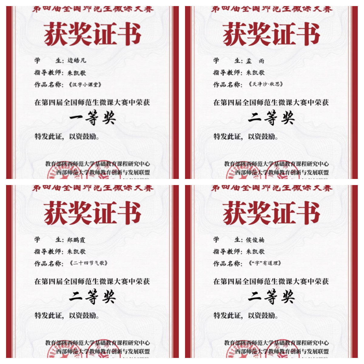 近日,全国师范生微课大赛组委会公布了第四届全国师范生微课大赛获奖名单。由公司朱凯歌老师指导,2020级汉语言文学专业边皓凡的微课作品《汉字小课堂》获一等奖,孟雨的《天净沙·秋思》、郑鹏霞的《二十四节气歌》、侯俊楠的《“字”有道理》、2020级戏剧影视文学专业王卫湘的《百变的汉字用法》获二等奖;秦玉莲老师指导,2020级汉语言文学专业成彬彬的《白杨礼赞之象征手法》获二等奖,赵燕飞老师指导,王永慧的《iu和ui趣分》获二等奖。