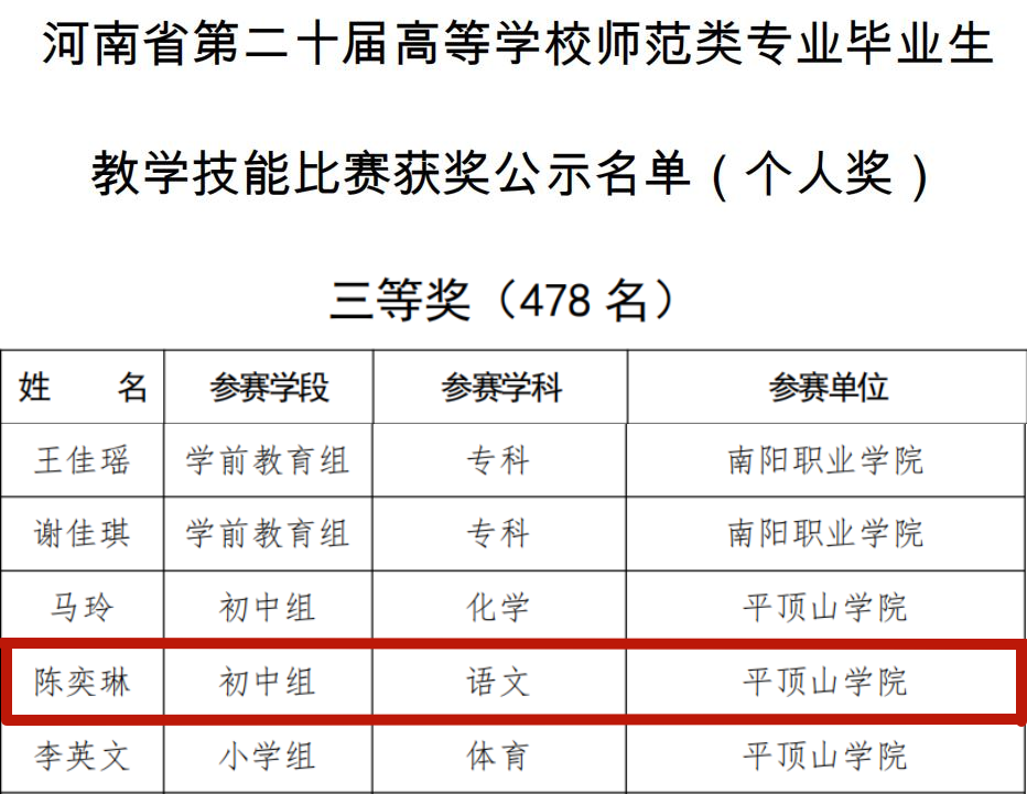 近日,河南省教育厅公布了第二十届高等公司师范类专业毕业生教学技能比赛获奖结果,公司2019级汉语言文学专业员工陈奕琳获初中组三等奖,彭月星获优秀辅导奖。