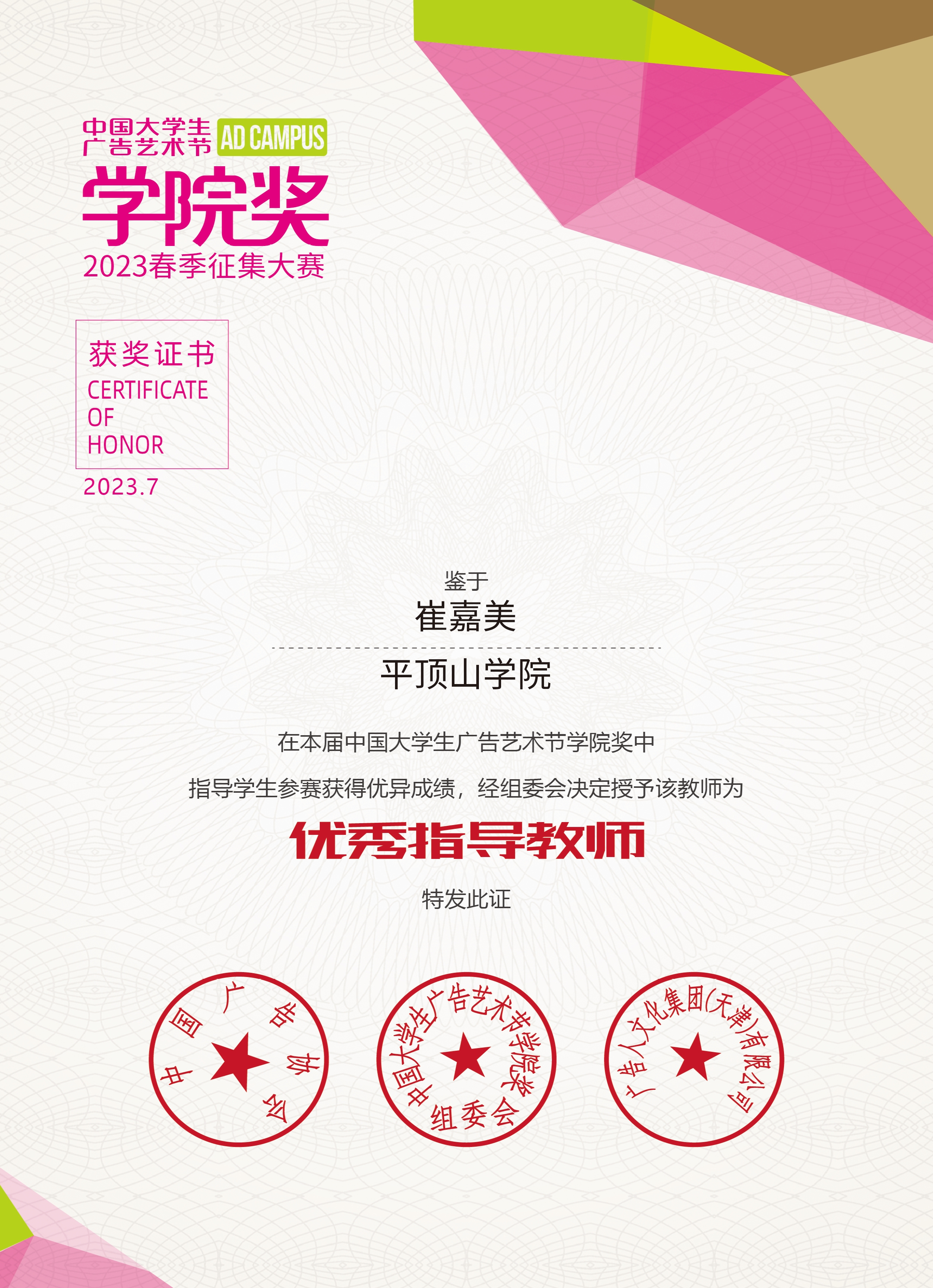 近日,中国老员工广告艺术节公司奖组委会公布了2023年春季征集大赛获奖名单,公司师生作品获多个奖项,其中,2020级戏剧影视文学专业王梦真等4人的《国香传承草本呵护》,朱馨雨等3人的《华润紫竹——毓婷》,乔雯娜等4人的《菊花特工》获短视频类优秀奖,霍利杰等4人的《困累喝乐虎》获影视广告类优秀奖,谭健等4人的《丝滑水润003》,李汶珂的《榄住夏日浪漫》获影视广告类入围奖,崔嘉美获优秀指导教师称号。