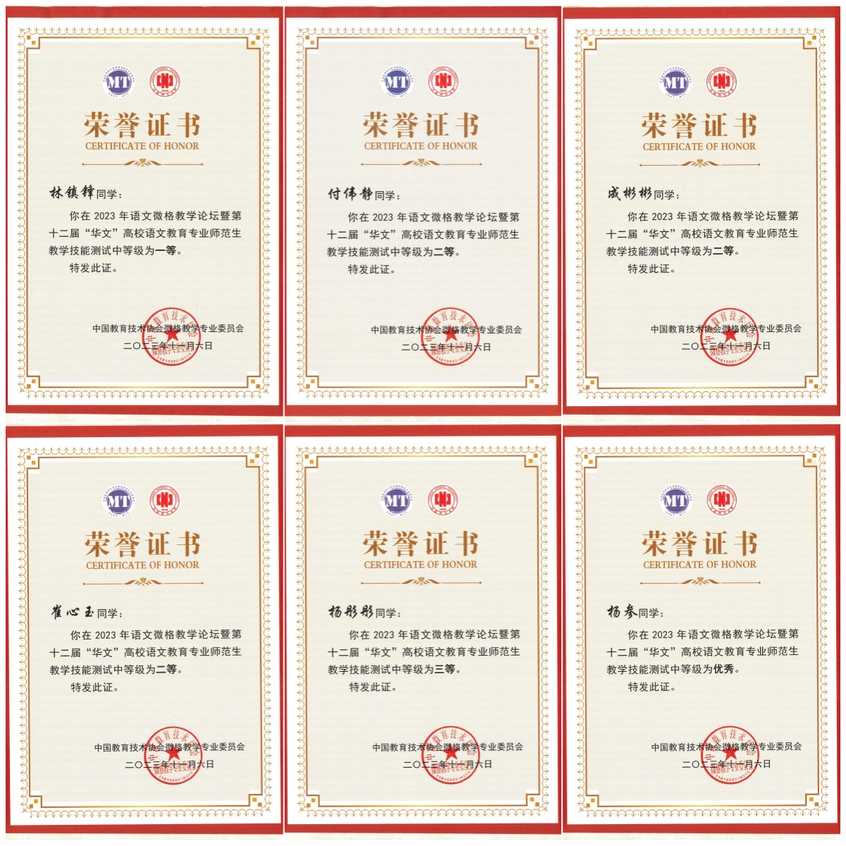 11月3日至6日,2023年语文微格教学论坛暨第十二届“华文”高校语文师范生教学技能测试与交流展示活动在江西师范大学瑶湖校区举行。公司16名师生获佳绩,在教学设计能力测试中,2021级汉语言文学专业付伟静获一等奖,2020级汉语言文学专业成彬彬、林镇锋获二等奖,2020级汉语言文学专业崔心玉、2021级汉语言文学专业杨彤彤获三等奖,2022级汉语言文学专业(专升本)杨参获优秀奖;在现场教学技能测试中,林镇锋获一等奖,成彬彬、崔心玉、付伟静获二等奖,杨彤彤获三等奖,杨参获优秀奖;高冠琳、陈一鑫、秦玉莲、赵焕亭、毋小利、张朋歌、彭月星、刘亚科、朱凯歌和赵晓婕等10位教师获优秀指导奖。