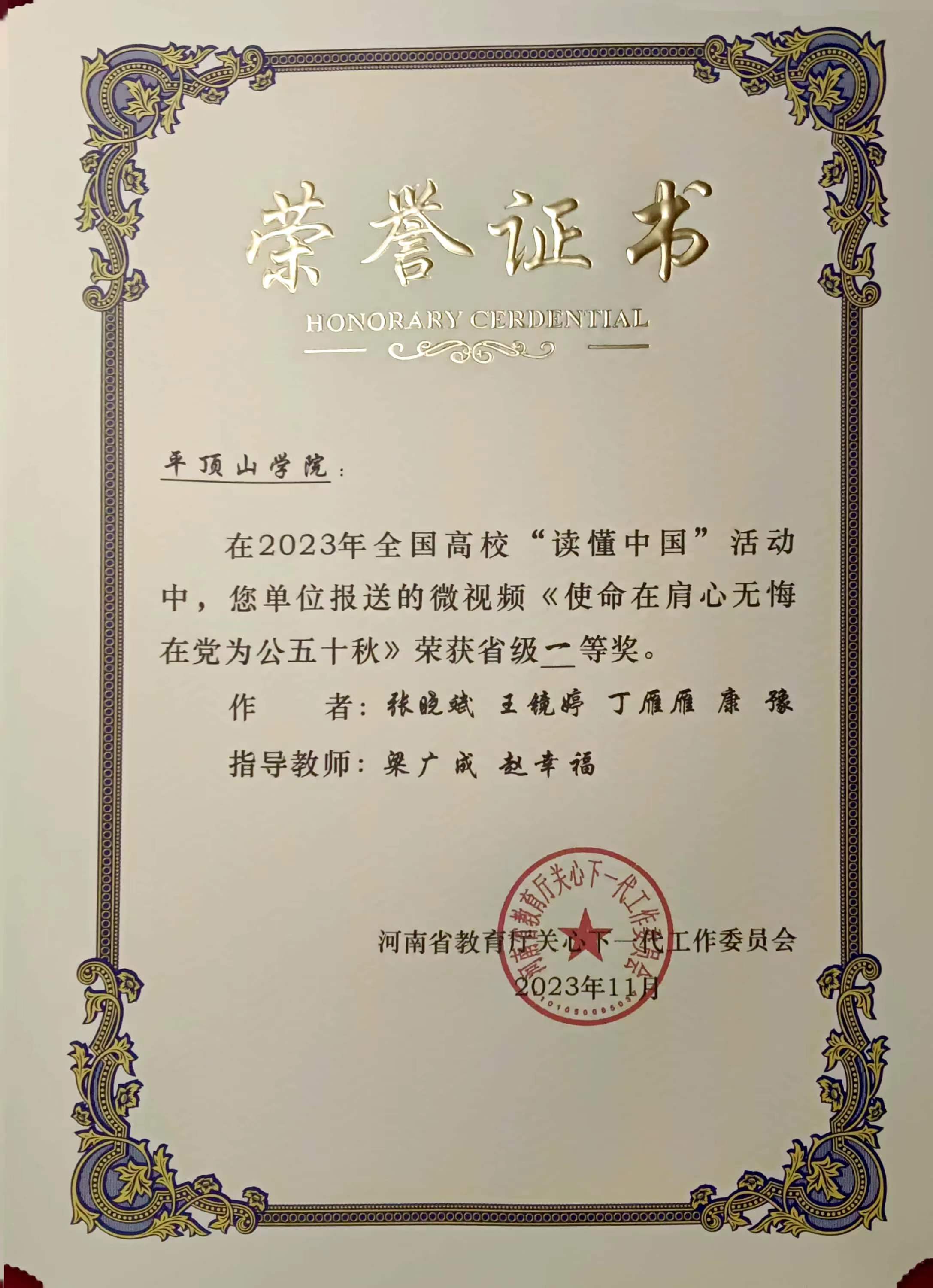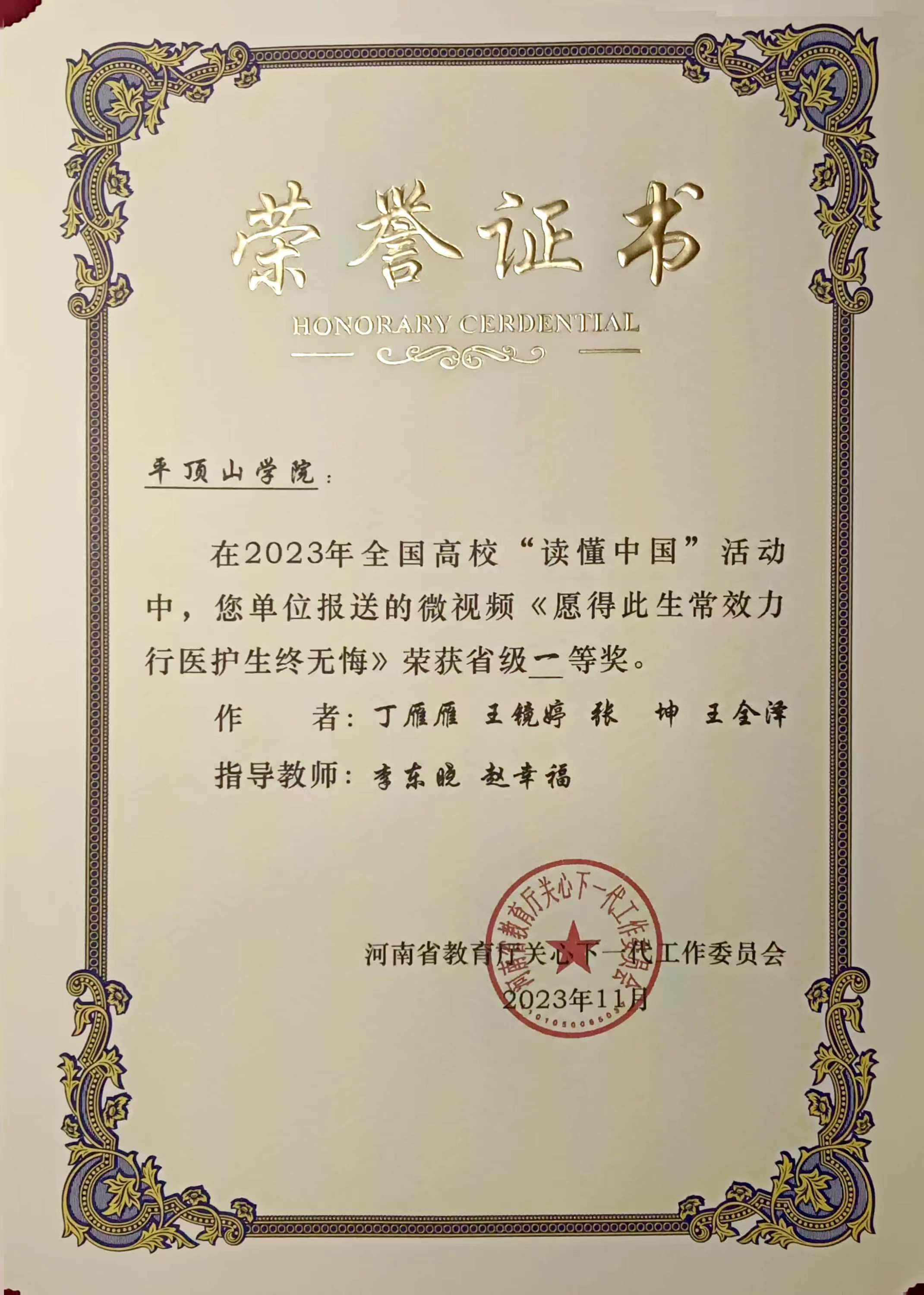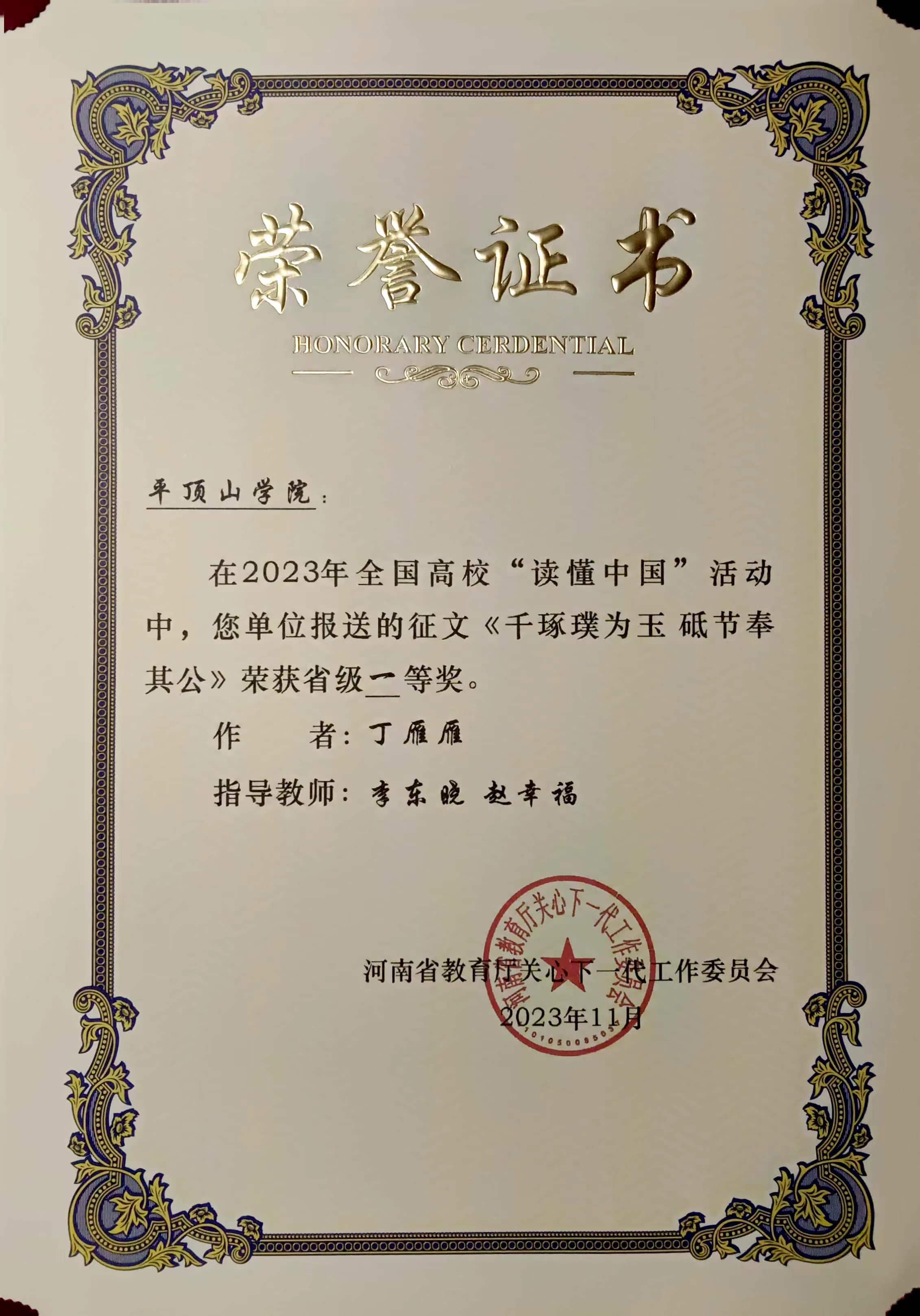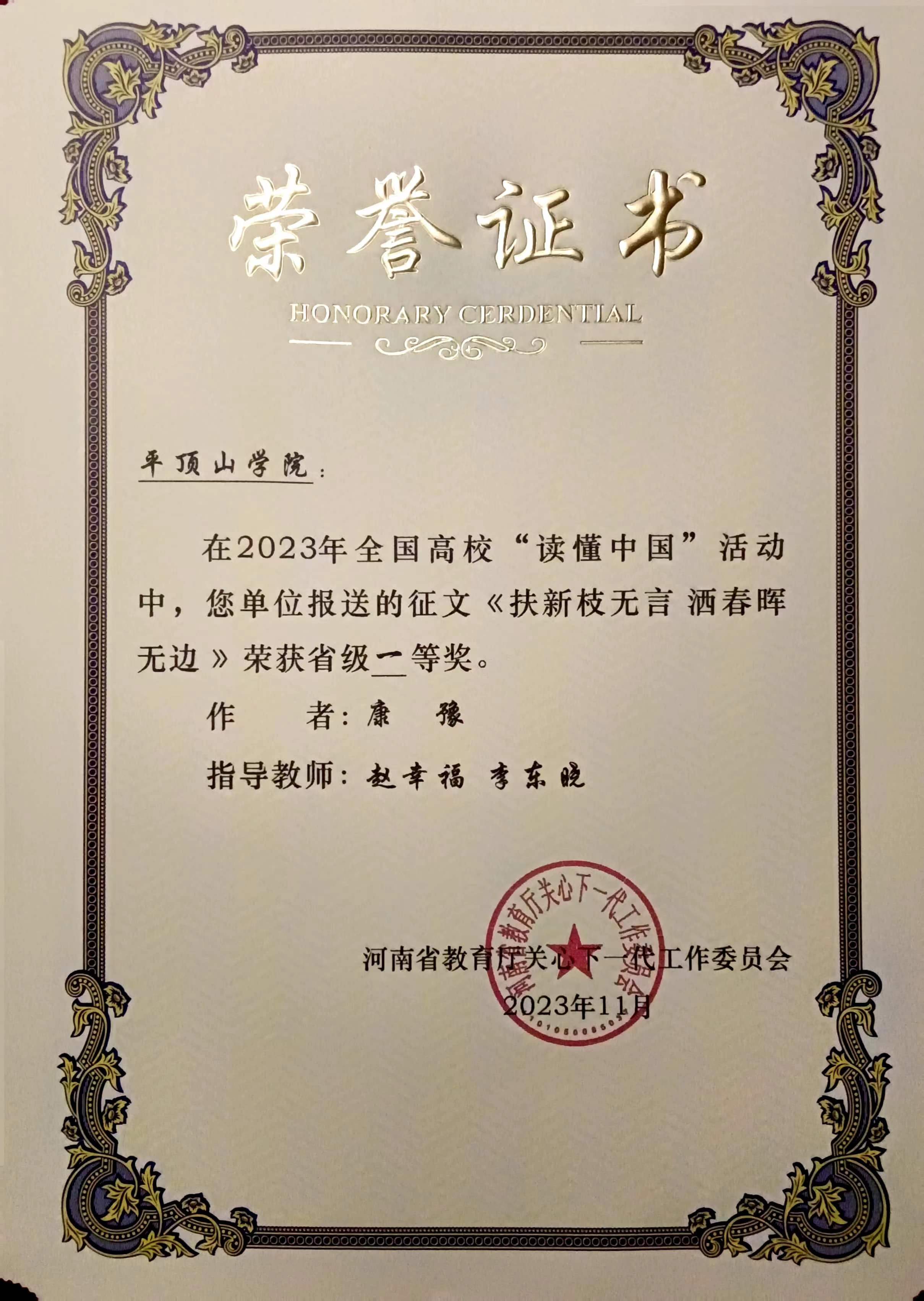近日,河南省教育厅关心下一代委员会印发《关于公布全省高校“读懂中国”活动评审结果的通知》(豫教关[2023]25号),由公司李东晓老师指导,丁雁雁撰写的《千琢璞为玉 砥节奉其公》、康豫撰写的《扶新枝无言 洒春晖无边》荣获征文类一等奖;由李东晓老师参与指导,2020级、2021级汉语言文学专业员工王镜婷、丁雁雁、康豫参与创作的微视频作品《使命在肩心无悔 在党为公五十秋》《愿得此生常效力 行医护生终无悔》荣获微视频类一等奖。