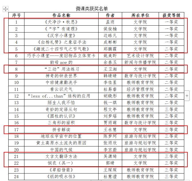 近日,公司教务处公布了2022年度师范生信息化教学应用能力大赛结果,公司共39名员工获奖。其中,孟雨、侯俊楠、边皓凡、成彬彬获微课类一等奖,郑鹏霞、王卫湘获二等奖,王永慧、吴潇琦、郭晴获三等奖;张帅莹获课件类一等奖,王涵玉、李丹阳、耿梦、崔心玉等7人获二等奖,李笑、岳静怡、王宝樱、代敬琪等22人获三等奖。
